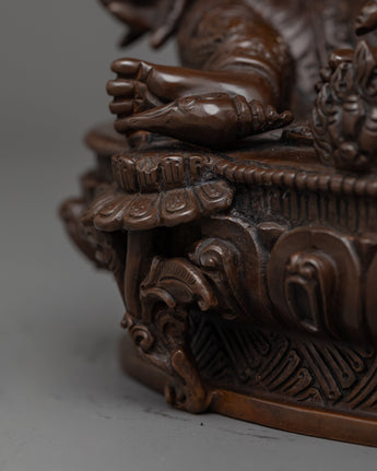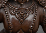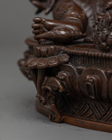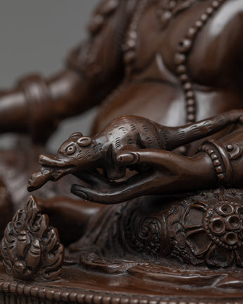 Introducing our Jewels Buddha Sculpture Dzambhala, a captivating piece Rising 8.5 inches tall with a base measuring 7.3 inches. Weighing 2.02 kg, this sculpture is crafted from high-quality oxidized copper and embodies the essence of Dzambhala's blessings of wealth and prosperity. What truly sets this sculpture apart is the meticulous craftsmanship of skilled artisans, who have captured the intricate details and spiritual significance of Dzambhala's iconography.