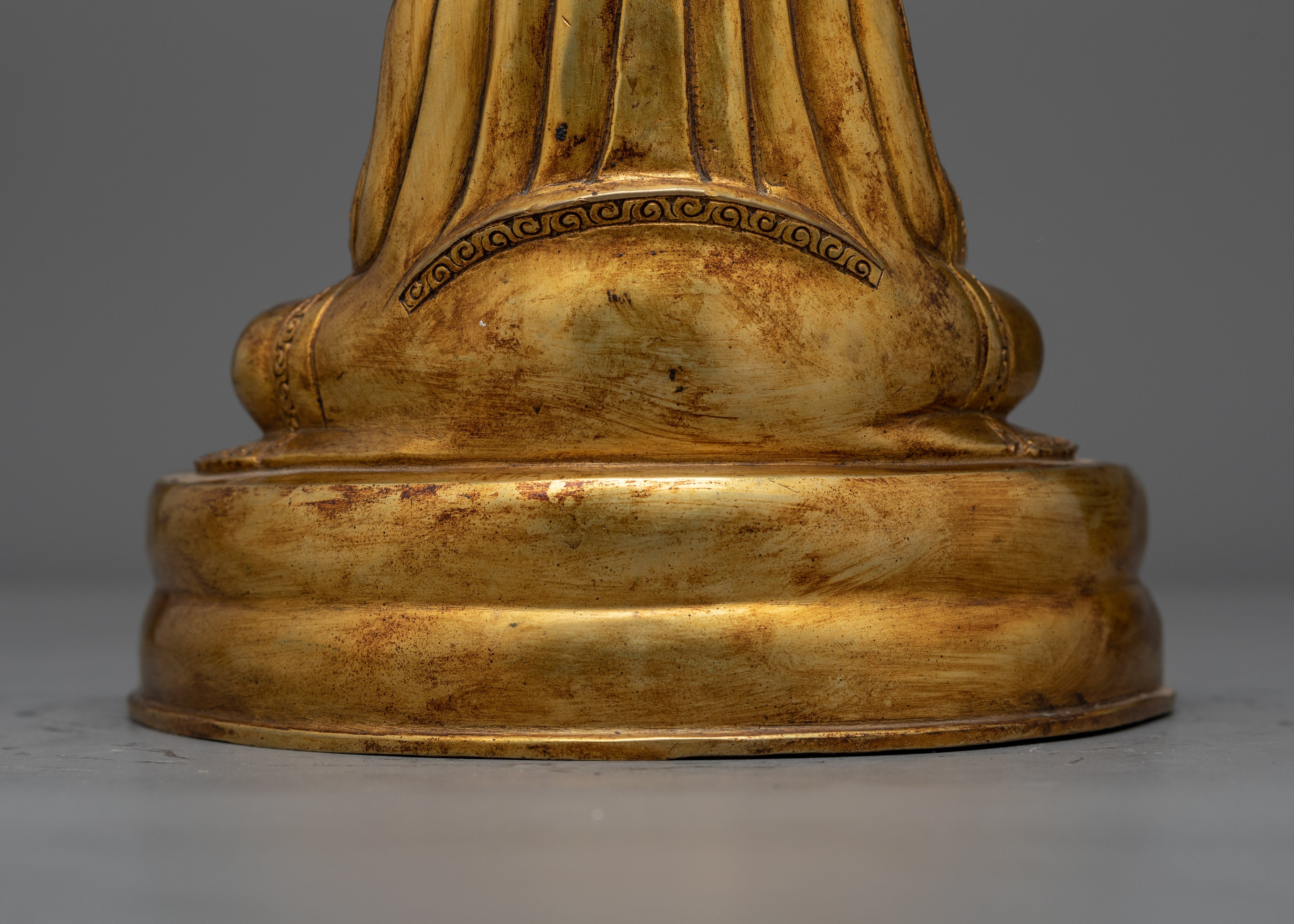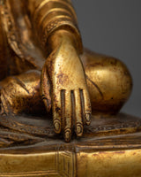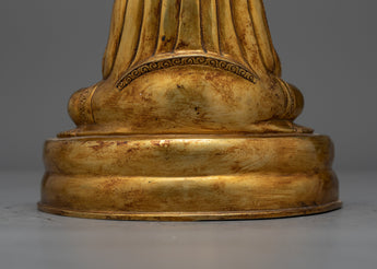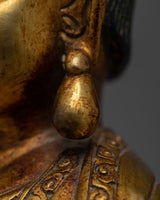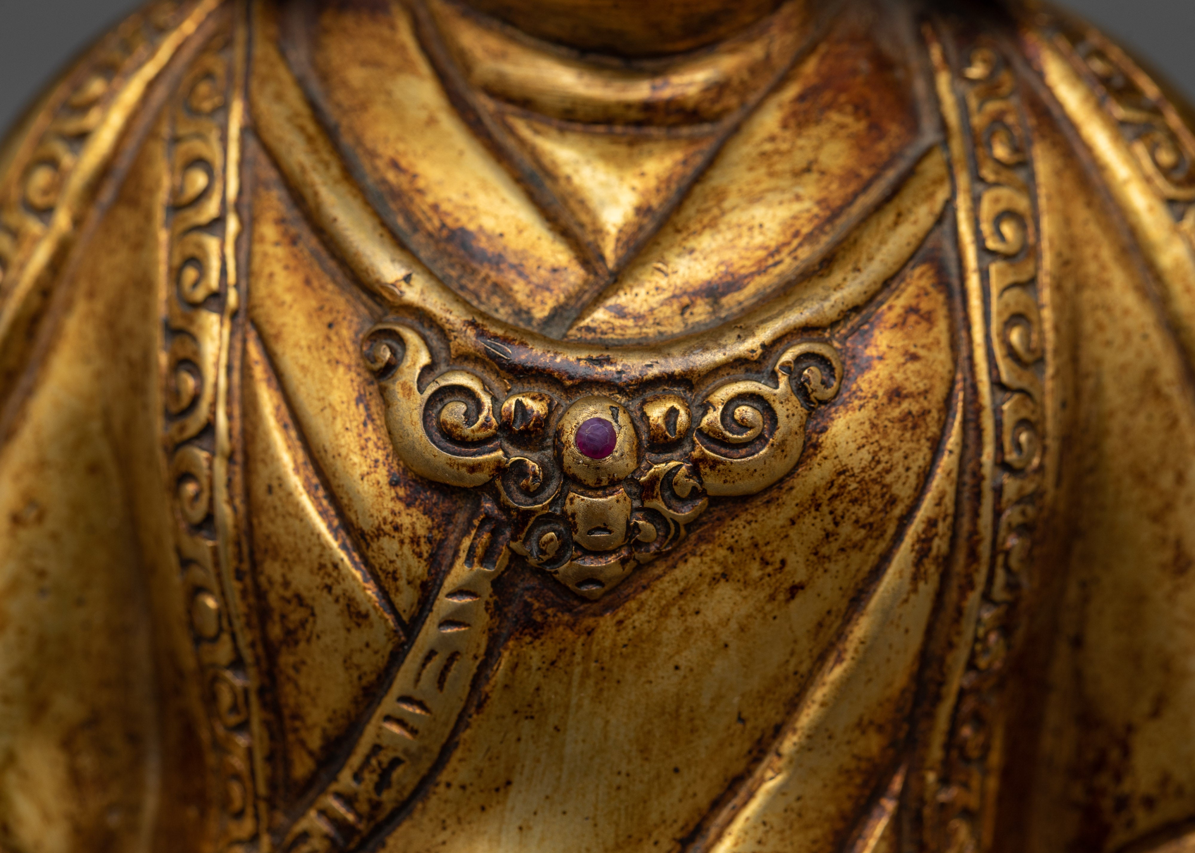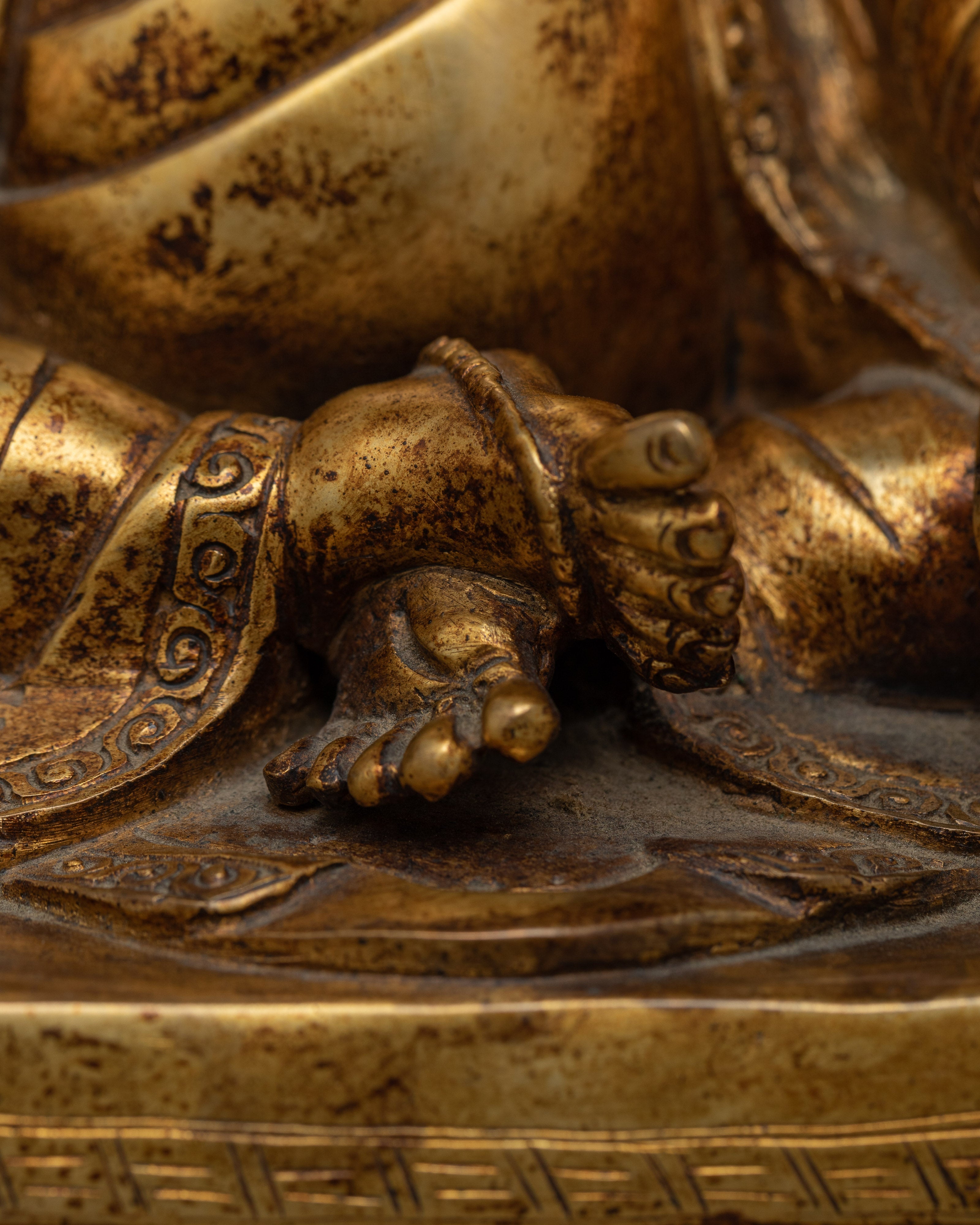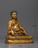 The statue is carefully handcrafted with a copper body and embellished with 24K gold gilding. Its deep etchings of Marpa's dignified robes and wise expression are highlighted by an antique finish. His features are given more depth by the acrylic painting, which also perfectly captures the essence of the great teacher and translator who introduced many Vajrayana scriptures to Tibet. Its substantial presence and weight of 2.12 kg make it perfect for any area used for learning, meditation, or honoring Tibetan Buddhist ancestry.