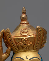 Presenting the sculpture of the Karmapa, a highly esteemed person in Tibetan Buddhism renowned for his profound spiritual instruction and insight. Standing just 7 inches tall with a 4.9-inch base and weighing 0.98 kg, this sculpture embodies the honorable spirit of the Karmapa tradition. Made of a copper body and gilded with 24K gold, it is further accentuated with intricate paintings in gold and acrylic that represent the Karmapa's teachings that highlight the way to enlightenment and his role as a spiritual leader.