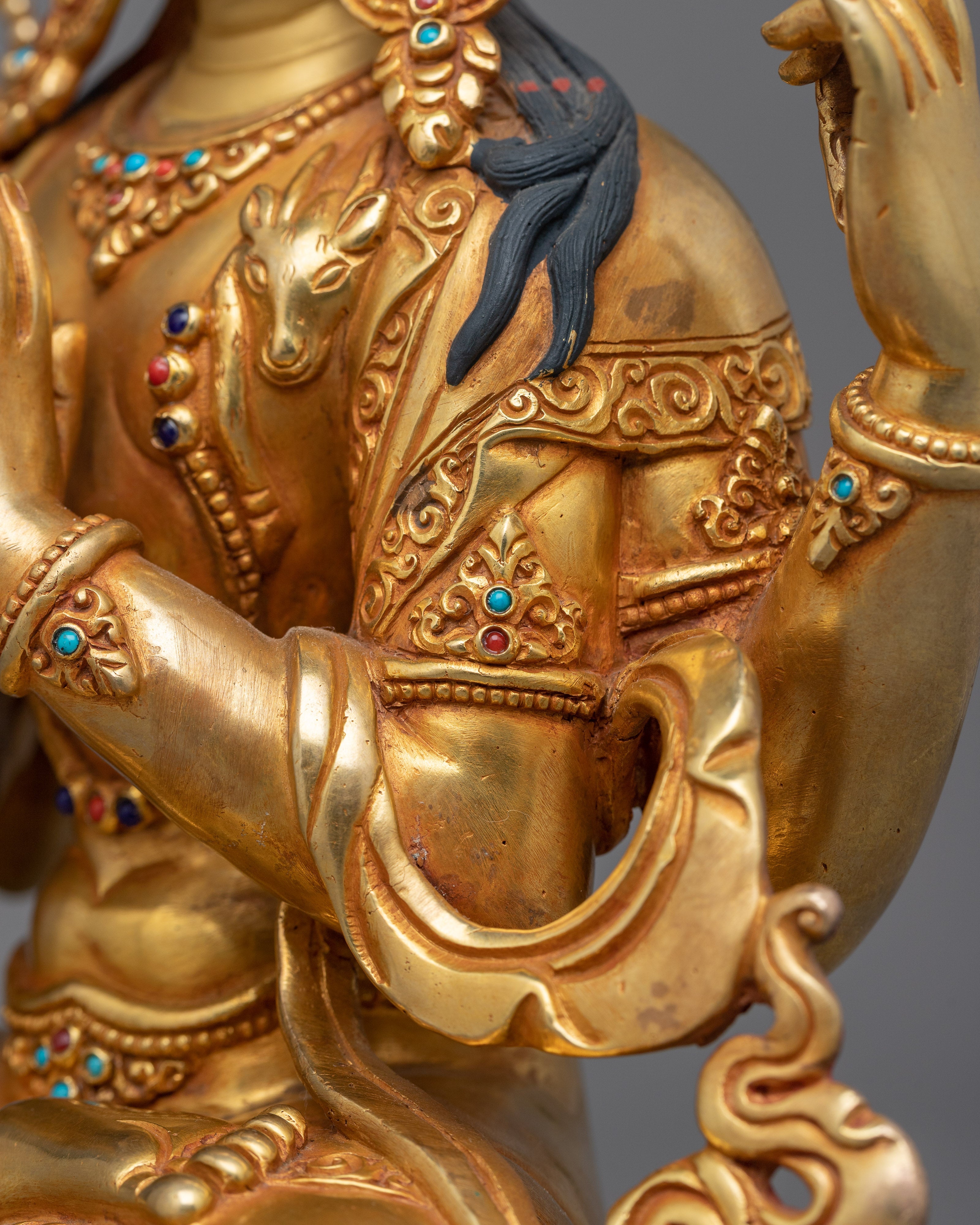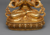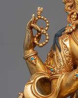 The Kind Deity Chenrezig Statue, which has a base of 9.1 inches and an elegant height of 12.4 inches, invites you to admire its fine craftsmanship. The sculpture exudes an infinite amount of kindness and compassion since it is made entirely of copper and is covered in layers of 24K gold gilding. The deftly painted gold and acrylic accentuate the statue's heavenly presence, and the expert artistry of the skilled artisans highlights the subtle aspects of Chenrezig's placid visage. As a treasured representation of dedication and inner serenity, this statue embodies compassion and enlightenment in every brushstroke.