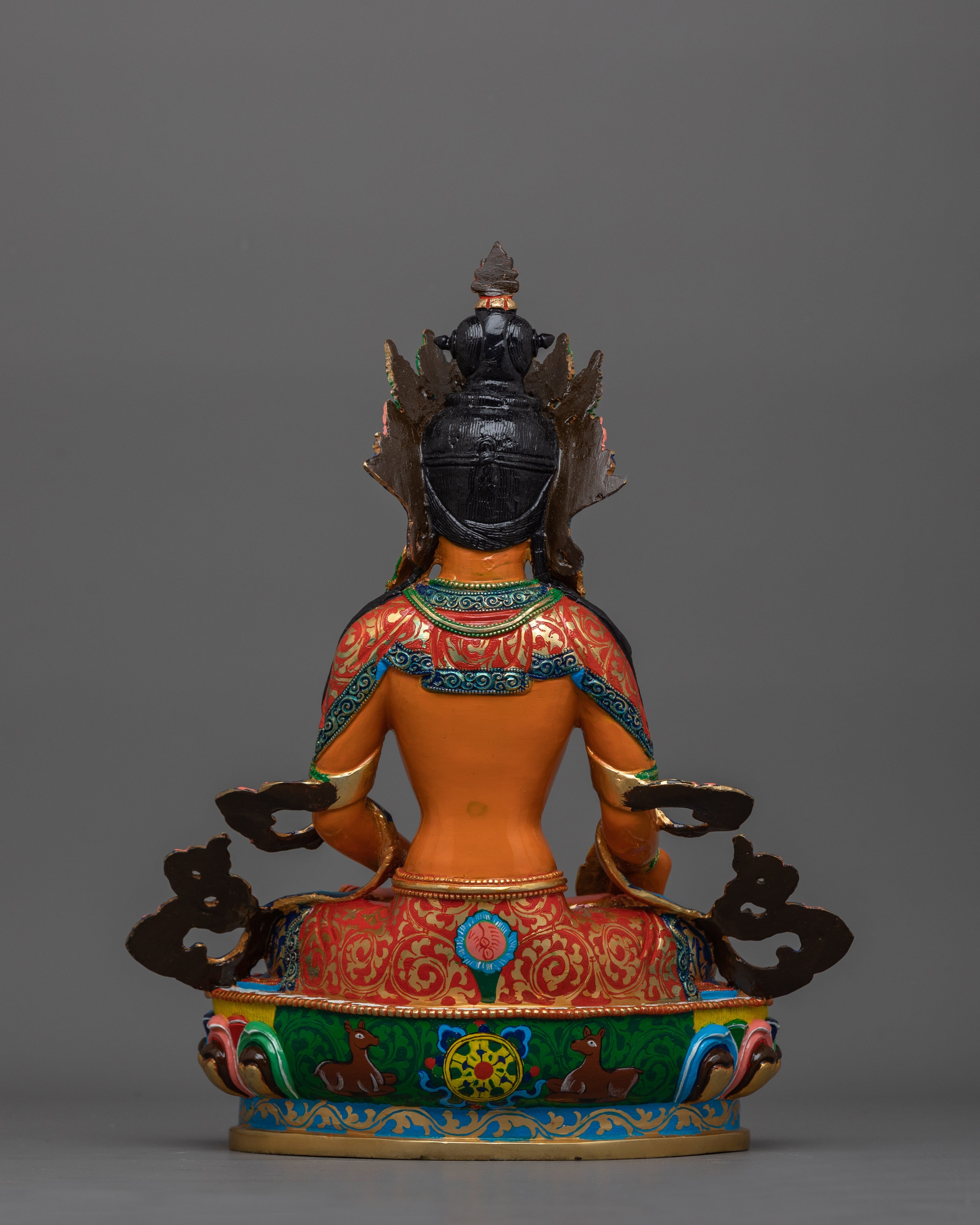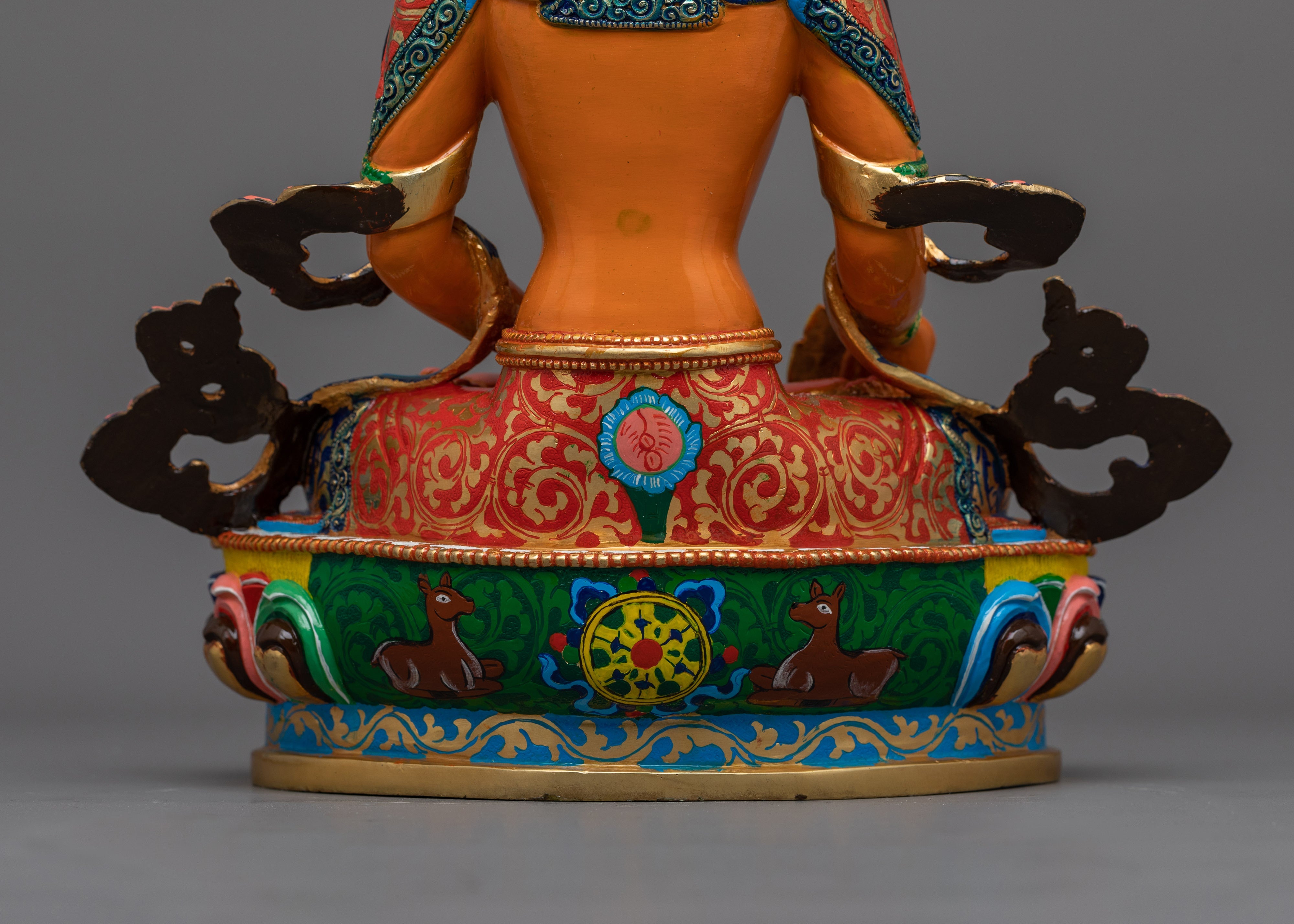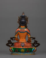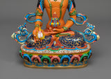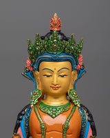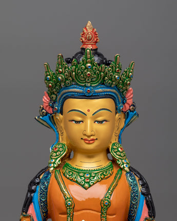 Standing 13.2 inches tall, this statue is adorned with 24K gold gilding, which highlights Kshitigarbha's caring presence. The gold and acrylic paintings provide depth and warmth to his peaceful demeanor and flowing robes, reflecting his unwavering commitment to alleviating suffering. The copper body highlights each intricate feature, including Kshitigarbha's staff and wish-fulfilling diamond, which represent direction and compassionate salvation. This statue represents Kshitigarbha's compassionate character and serves as a reminder of his pledge to guide all beings to liberation, making it a valuable addition to any shrine, meditation place, or collection.