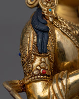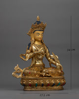 This statue radiates warmth and brightness since it was generously gilded in 24K gold and has a sturdy copper body. Kshitigarbha's calm demeanor and the accurate portrayal of his monastic robes are accentuated by the acrylic and gold paintings, which also represent his function as a protector and mentor. This large, 4.42-kilogram artwork is an embodiment of salvation and hope in addition to being used as décor.