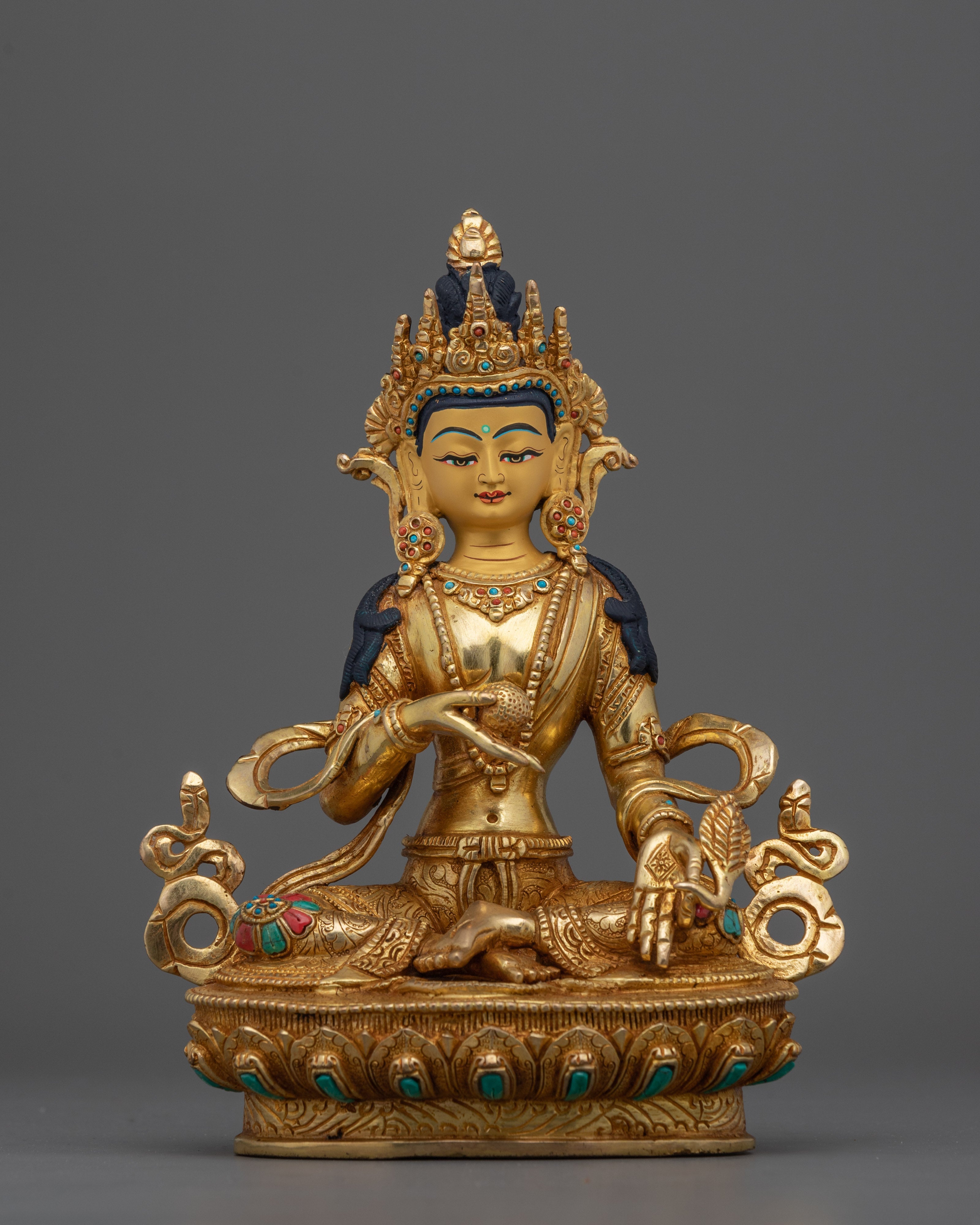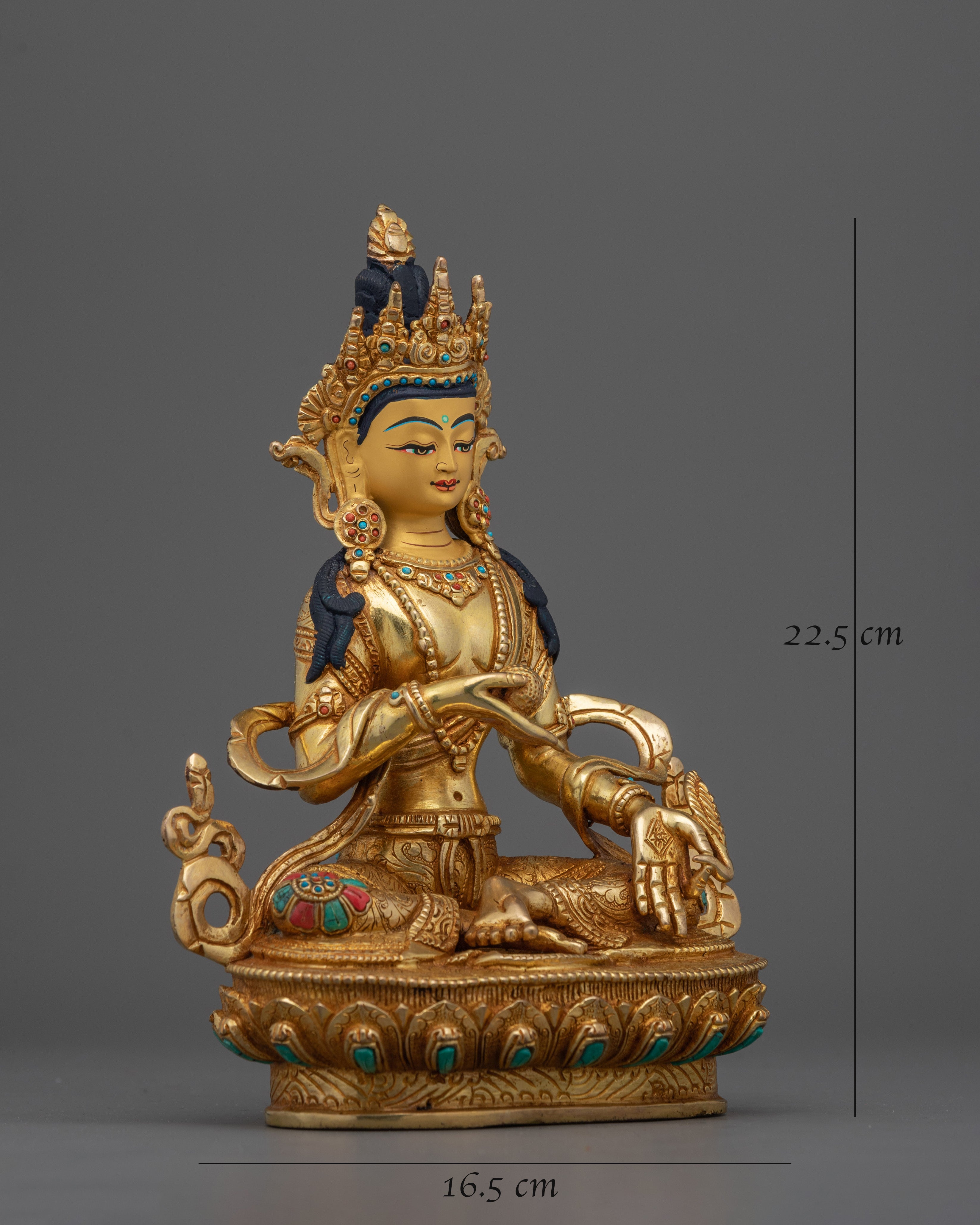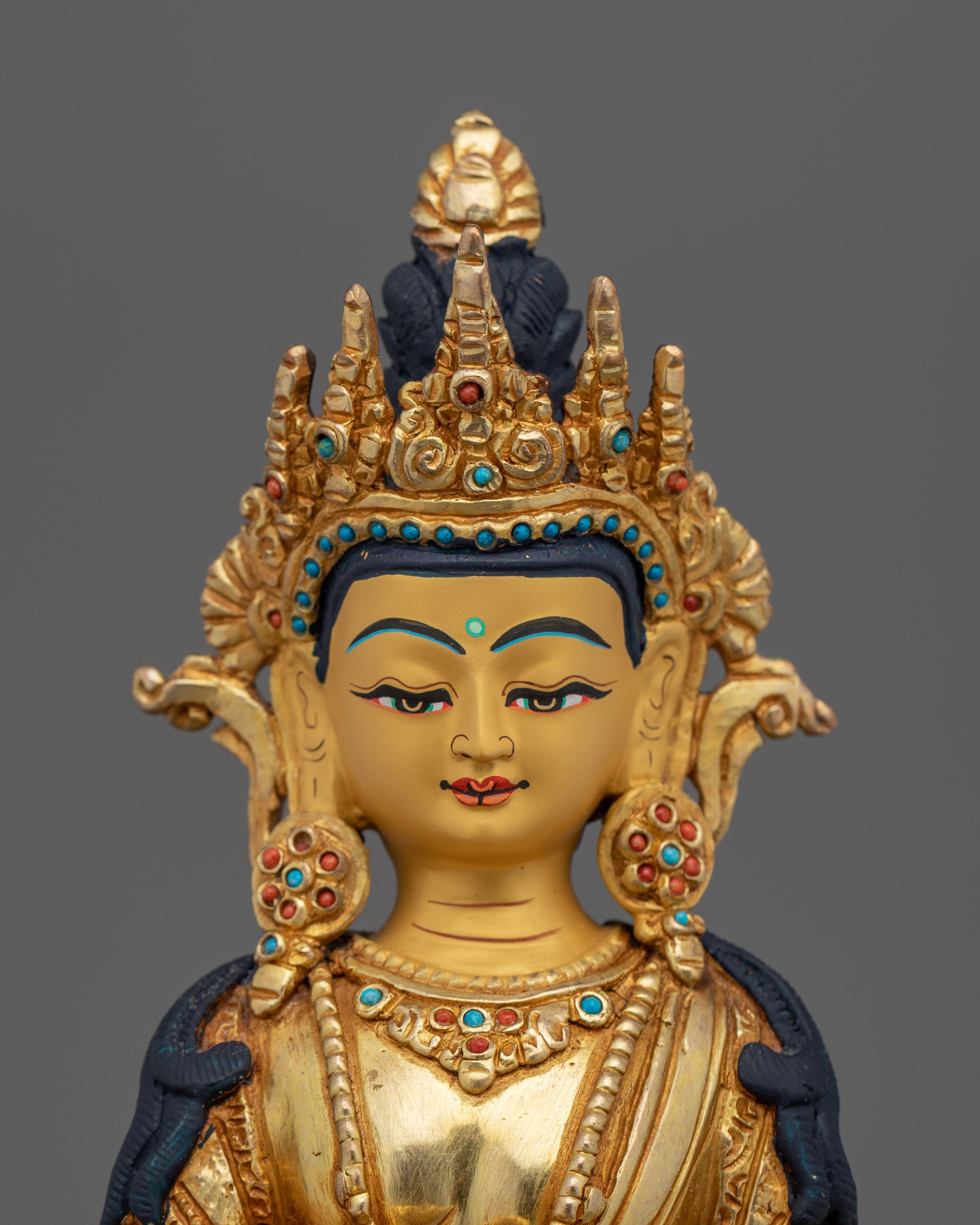 The finely made Kshitigarbha Ruler of Hell statue stands 8.9"/22.5 cm tall with a base width of 6.5"/16.5 cm and weighs 1.67 kg. This religious figurine is made of copper, gilded with 24K gold, painted in gold and acrylic, and adorned with hand-carved gemstones. This gorgeous sculpture portrays Kshitigarbha's commitment to saving all beings from suffering, particularly in the infernal realms, and would make an excellent addition to any Buddhist shrine, altar, or home decor.