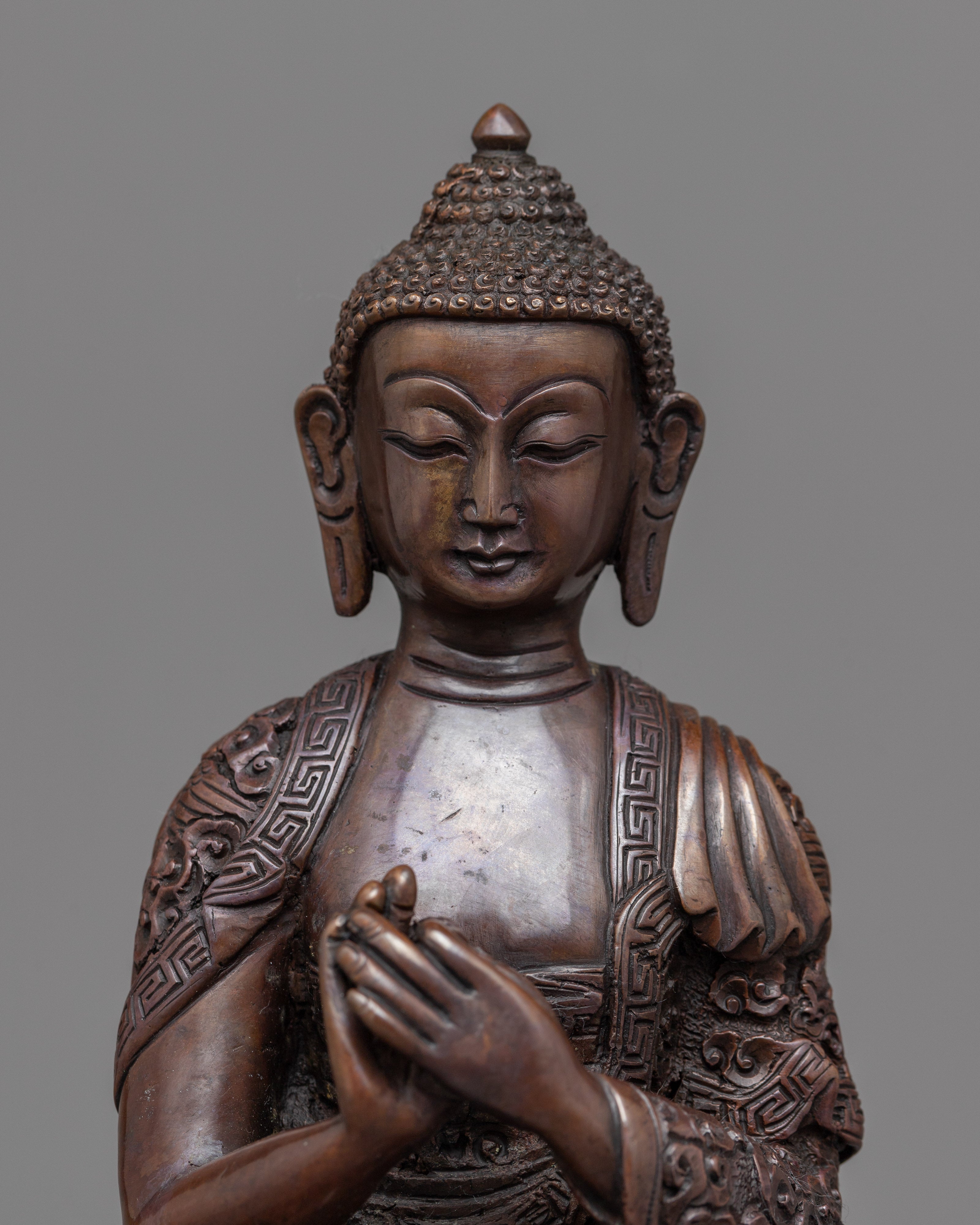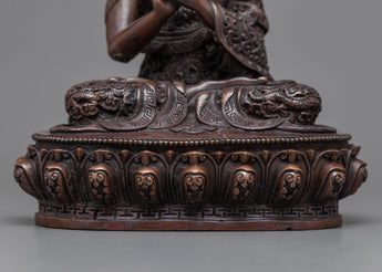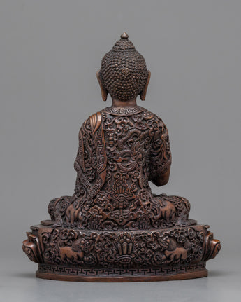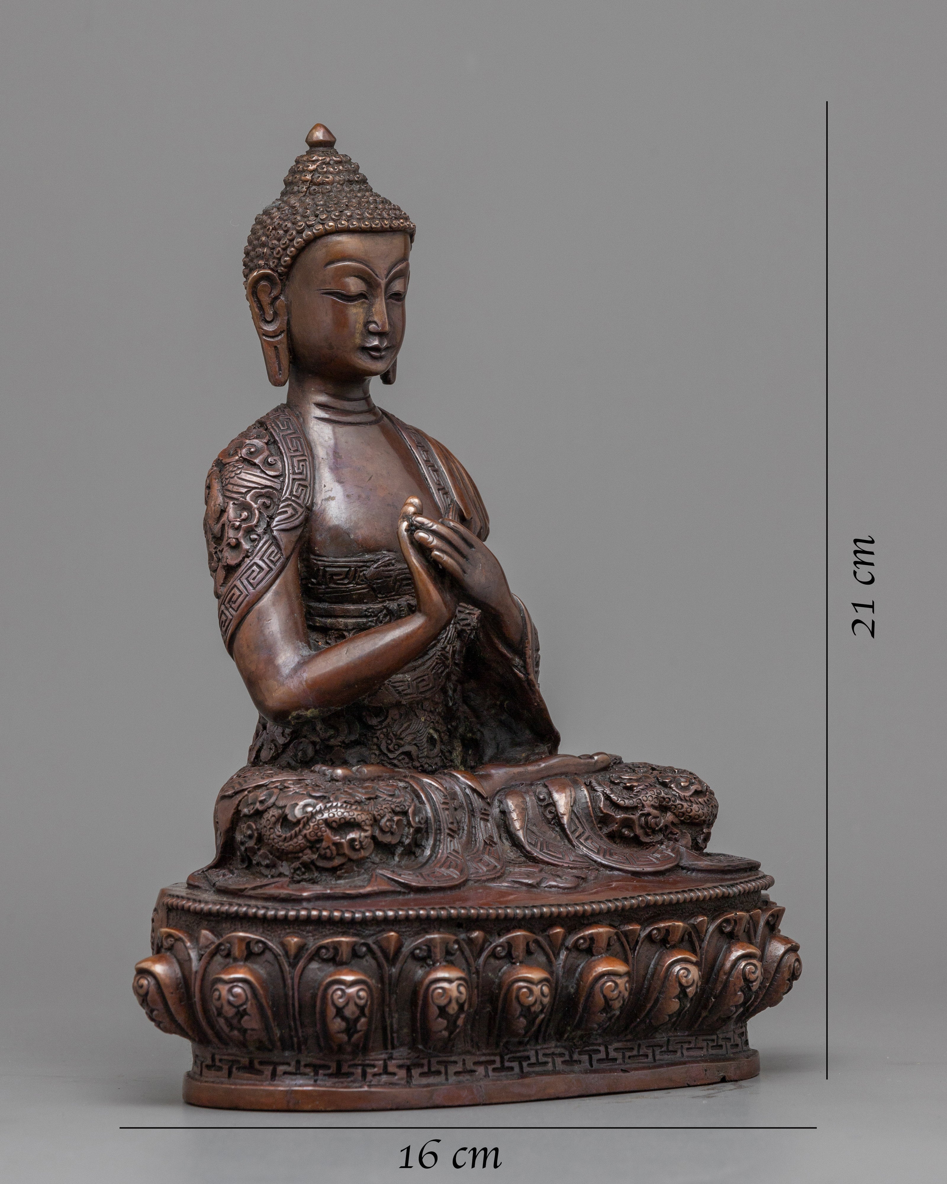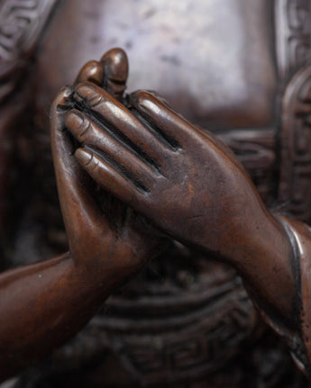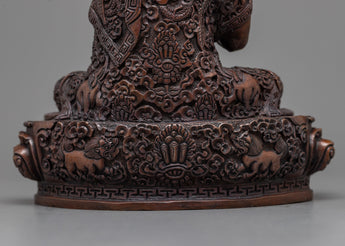 Begin your road to enlightenment with this magnificent statue's mesmerizing image of Kunrig, a manifestation of the Vairochana Buddha. The oxidized copper body tells a story of rich heritage and profound wisdom with every exquisite detail, bringing admirers closer to the spiritual epiphanies that Vairochana Buddha signifies. This oxidized statue has a rich, deep tone that is reminiscent of time-honored traditions and spiritual depth. This statue is a must-have for anyone wishing to build a space of introspection and inner serenity. It is a monument to great craftsmanship and an enlightened journey that transcends time.