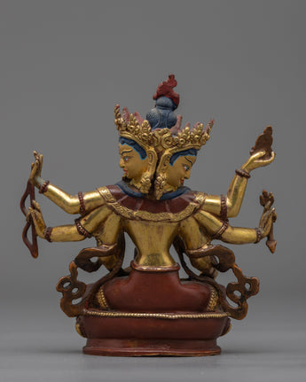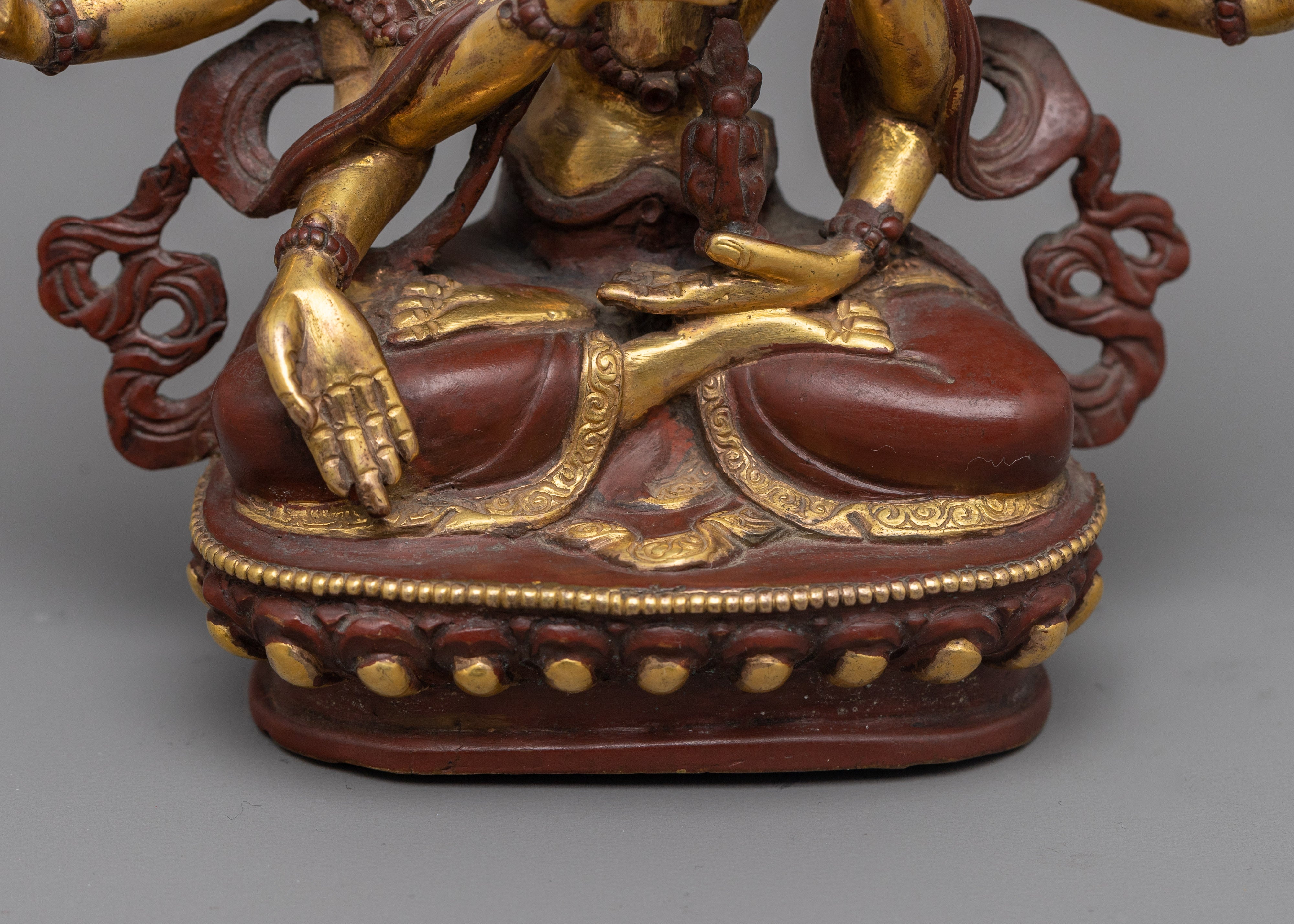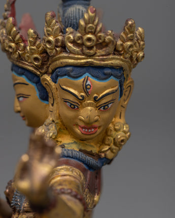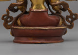 This delicate statue is beautifully rendered in an oxidized copper body, contrasting with the vibrant 24K gold gilding that highlights the intricate details of her many arms and the sacred implements they hold. The gold and acrylic paintings add a layer of richness and depth, illustrating Namgyalma's serene yet potent expression and her elaborate celestial robes.