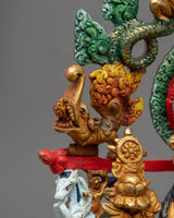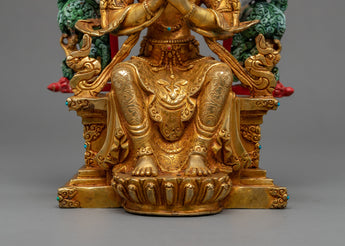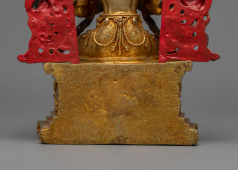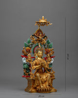 We have exquisitely hand-carved the Maitreya Buddha statue in traditional Himalayan art of Nepal. Genuinely gold gilded with a 24k gold sculpture of Buddha will be the best auspicious gift from Nepal to a practitioner like you. The color variation of jewels and ornaments is magnificently mesmerizing. Our sculpting artisan is tremendously significant in the Vajrayana Buddhism practice, passed through generations. We have used precious gemstones and corals and adorned them with rare and antique turquoise in a pure copper body. The materials used in this sculpture will significantly benefit you from the unusual damages and scratches. It took more than a month for us to sculpt and complete this statue reflecting high Buddhist motifs and practices.