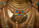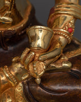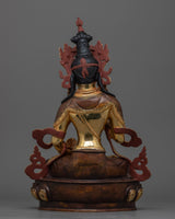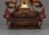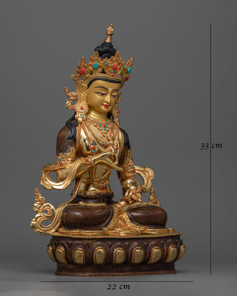 The statue, made of high-quality oxidized copper and gilded in 24K gold, emits divine presence. The elaborate gold and acrylic paintings bring out every single detail, from Vajrasattva's tranquil look to the lovely designs on his robe. Hand-carved gemstones adorn his crown and jewelry, lending an air of elegance and luxury. This statue, weighing 3.59 kg, is not only a visual delight, but also a powerful spiritual anchor for any sacred area.