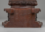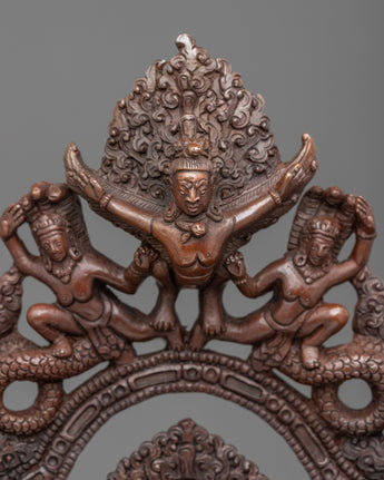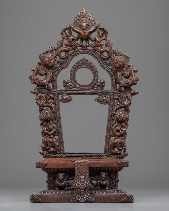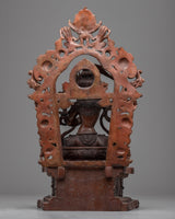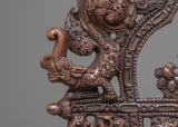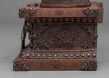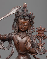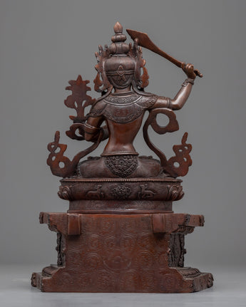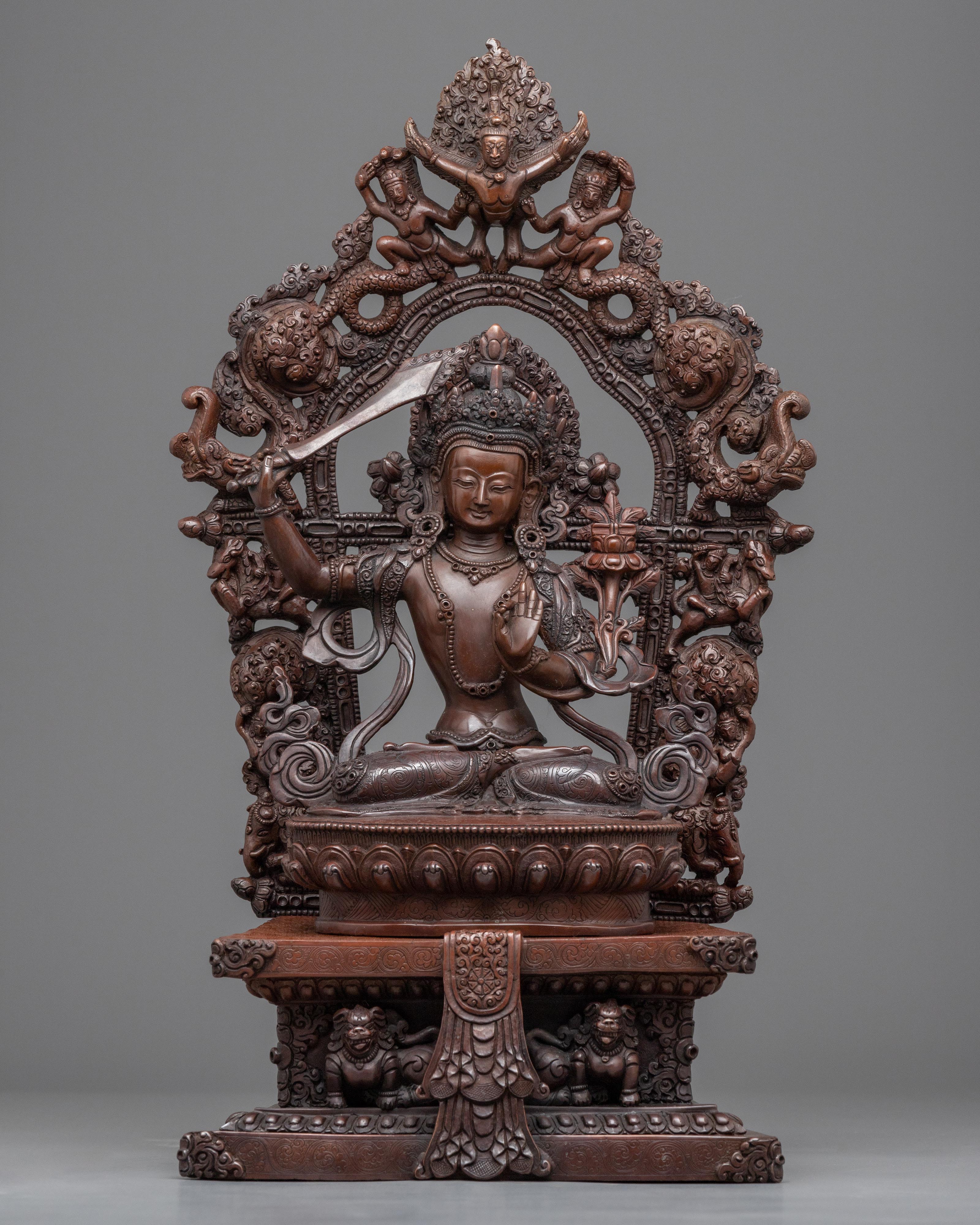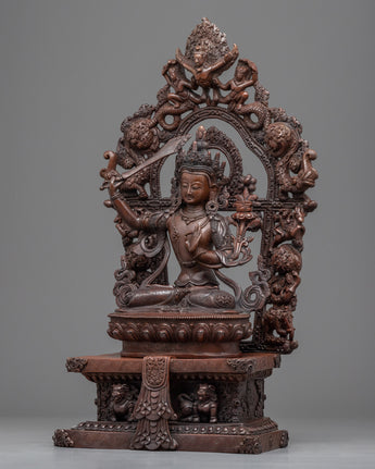 The Manjushri bodhisattva statue is an intricately handcrafted piece produced in our studio and designed with unique Nepali motifs. In the statue, the bodhisattva is depicted seated atop a moon disc lotus seat on an elaborately carved-out throne with a tender expression as he wields his flaming sword indicating his ability to cut through negativity and ignorance. His right hand performs the 'Vitraka Mudra,' symbolizing the transmission and discussion of Buddha's teachings. The statue comprises fully oxidized copper, which provides its final classic antique look. Our traditionally trained Vajrayana artists have carved delicate and beautiful motifs full of details over the course of a couple of months.
