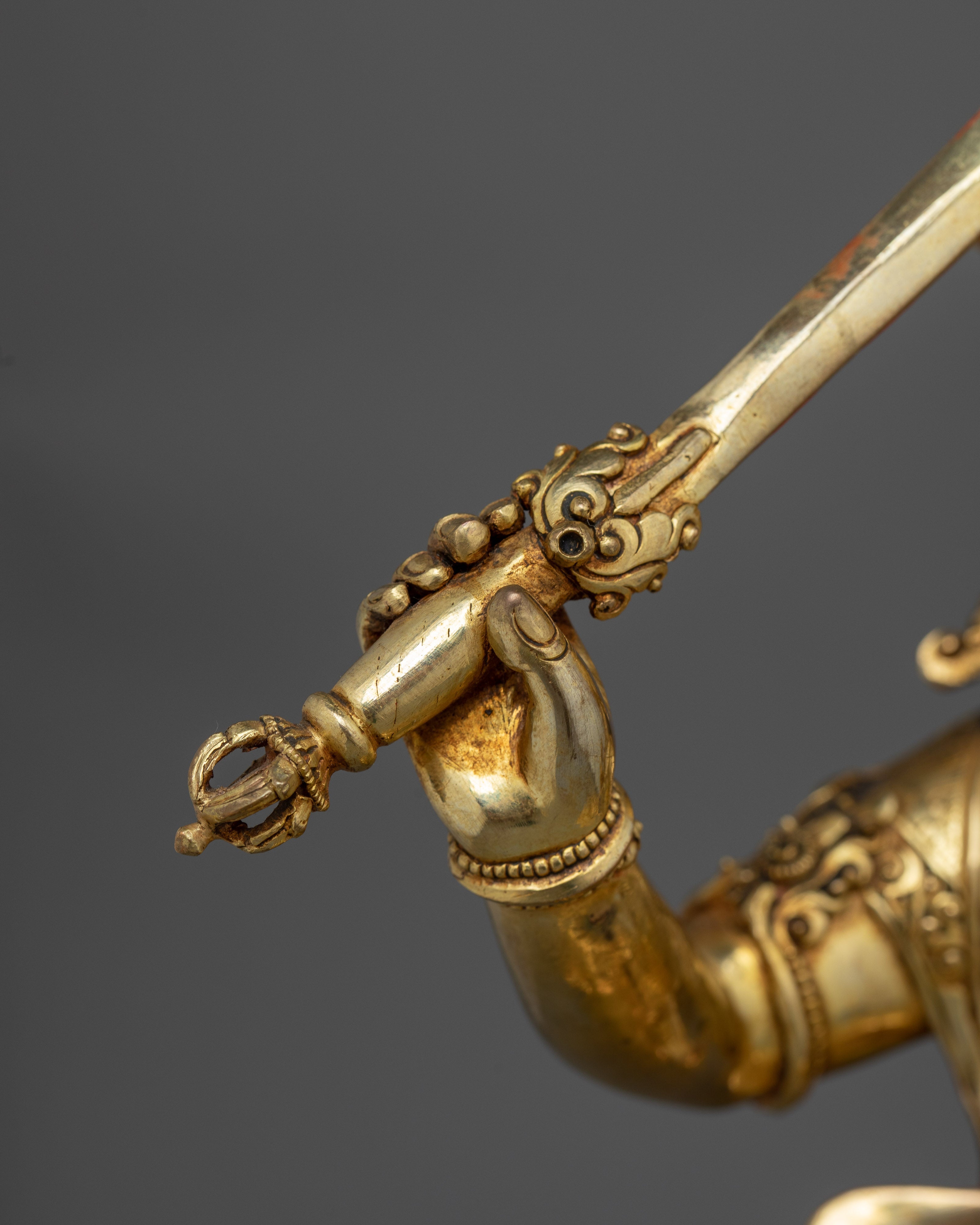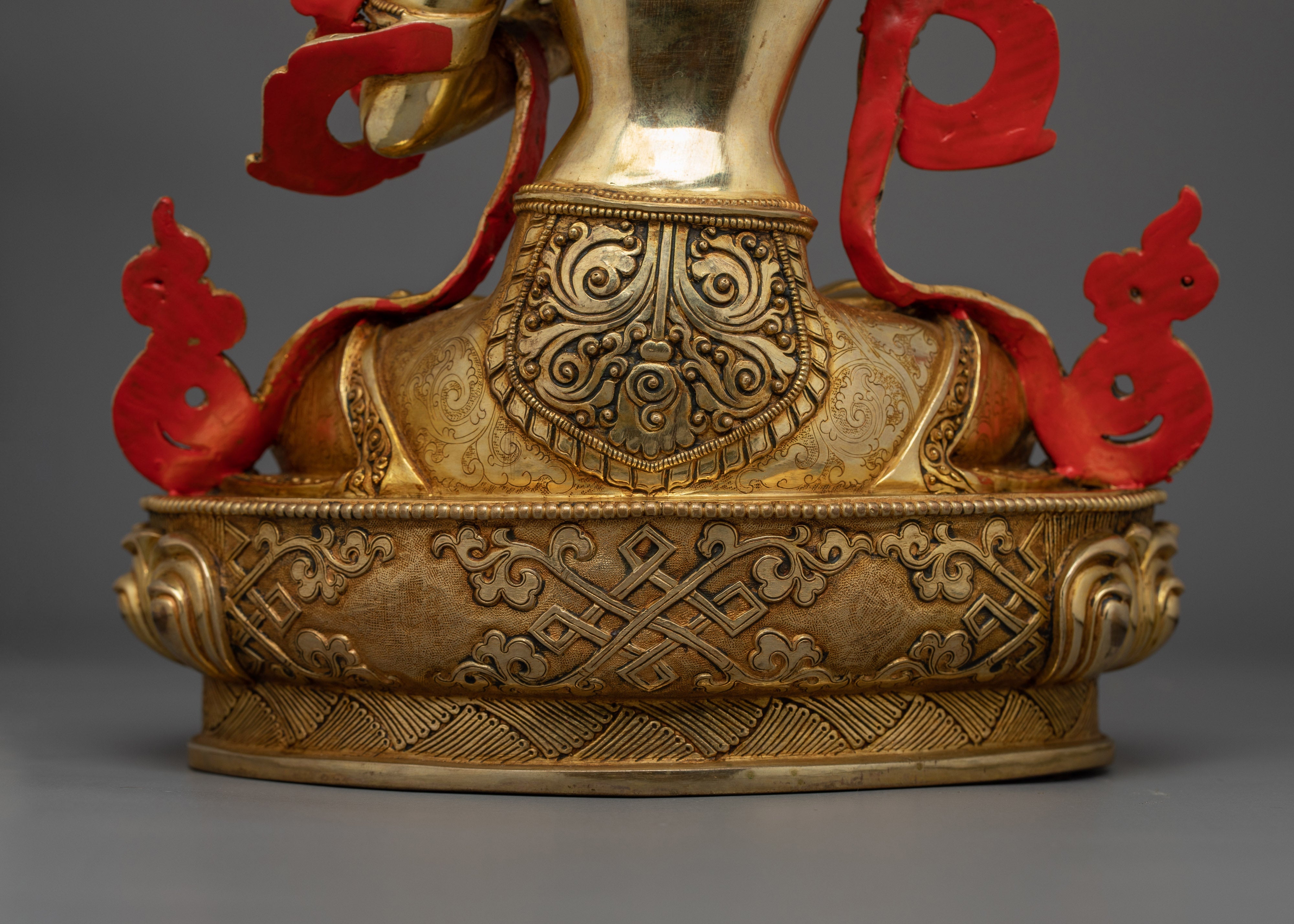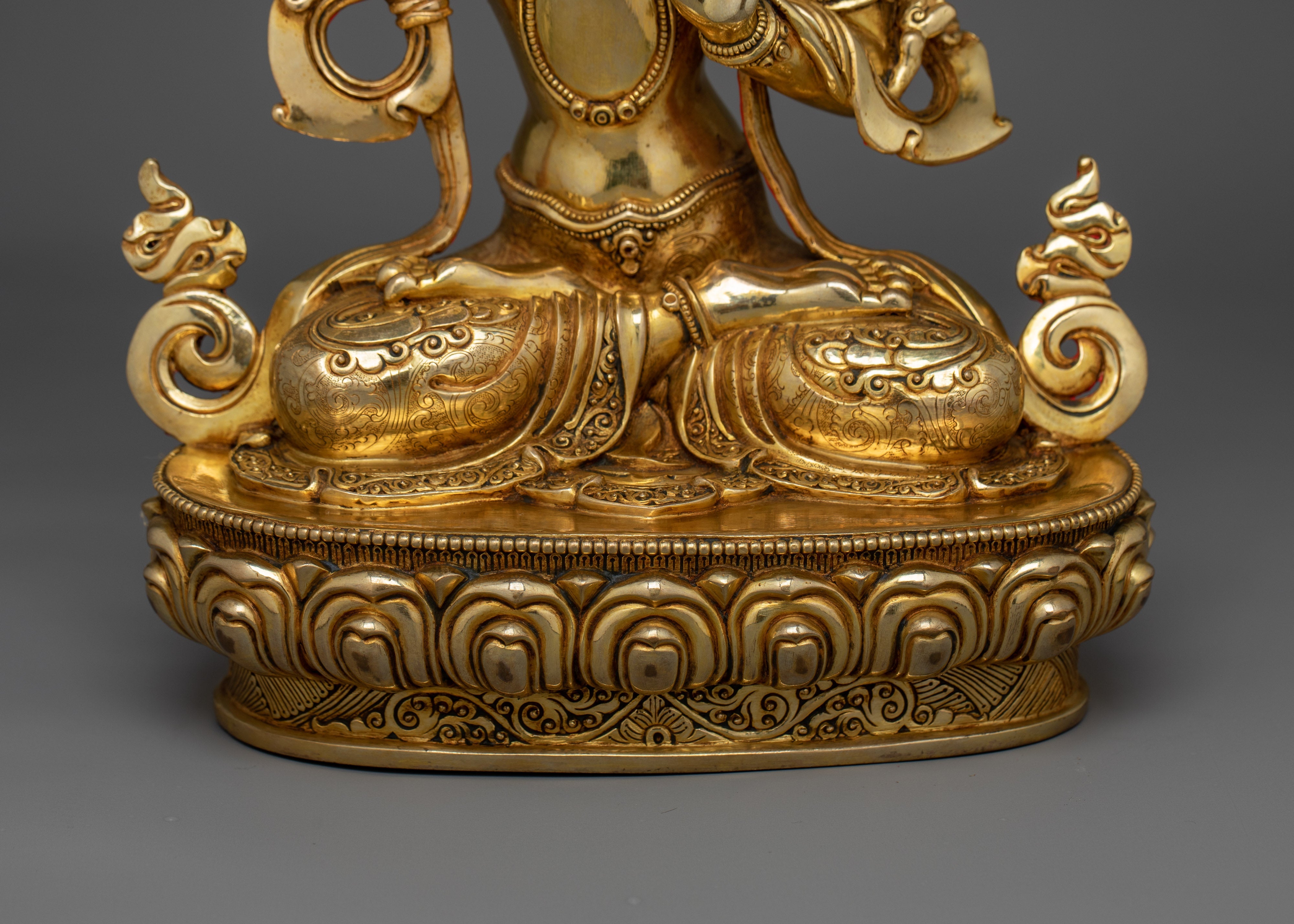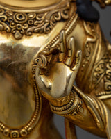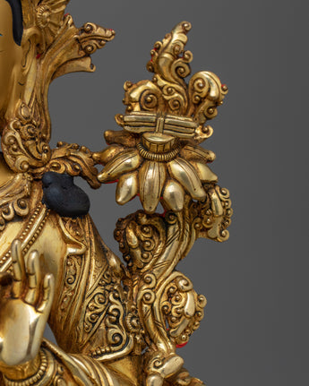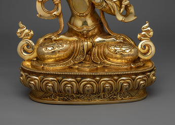 Feel the enlightened presence of this lovely Manjushri Gold Gilded 35cm Statue, a wonderful addition to your living or spiritual space. This 35-cm-tall statue is carefully constructed of a copper body and embellished with paintings in gold and acrylic, as well as 24K gold gilding. The minute details elevate the wisdom and serenity of your meditation or shrine space by capturing the essence of Manjushri with a calm expression and dynamic features.
