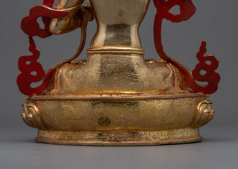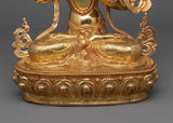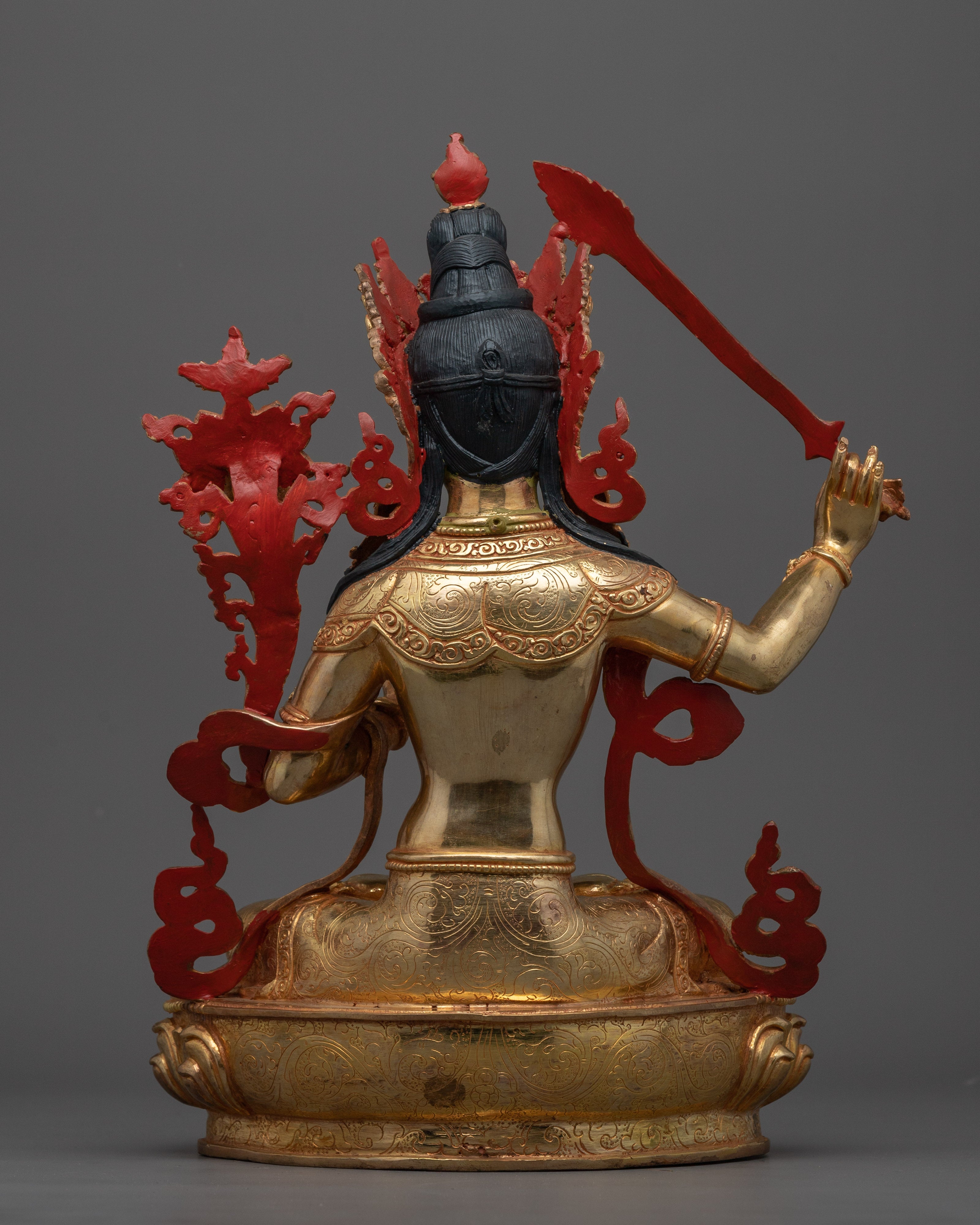 The deity is depicted seated over a moon disc lotus with a peaceful expression while he holds the sword of wisdom above his head and the book of knowledge lies in a blooming lotus. The deity is decorated with numerous body ornaments which have been embedded with precious gemstones. This hand-carved statue of the deity took our artists months of hard work to craft with a flawless design exclusively found in Nepal.