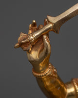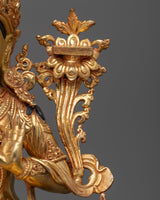 Standing 13.6 inches tall, this Manjushri Sacred Art statue depicts the Bodhisattva of Wisdom with great impact. This sculpture, made of copper and wonderfully embellished with 24K gold gilding, gold, and acrylic paintings, exudes a sense of celestial illumination. Every hand-sculpted detail demonstrates excellent craftsmanship, bringing the deity to life in a way that encourages tranquility and clarity in your sacred place.