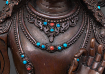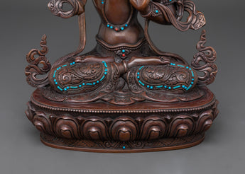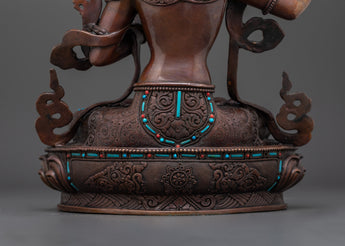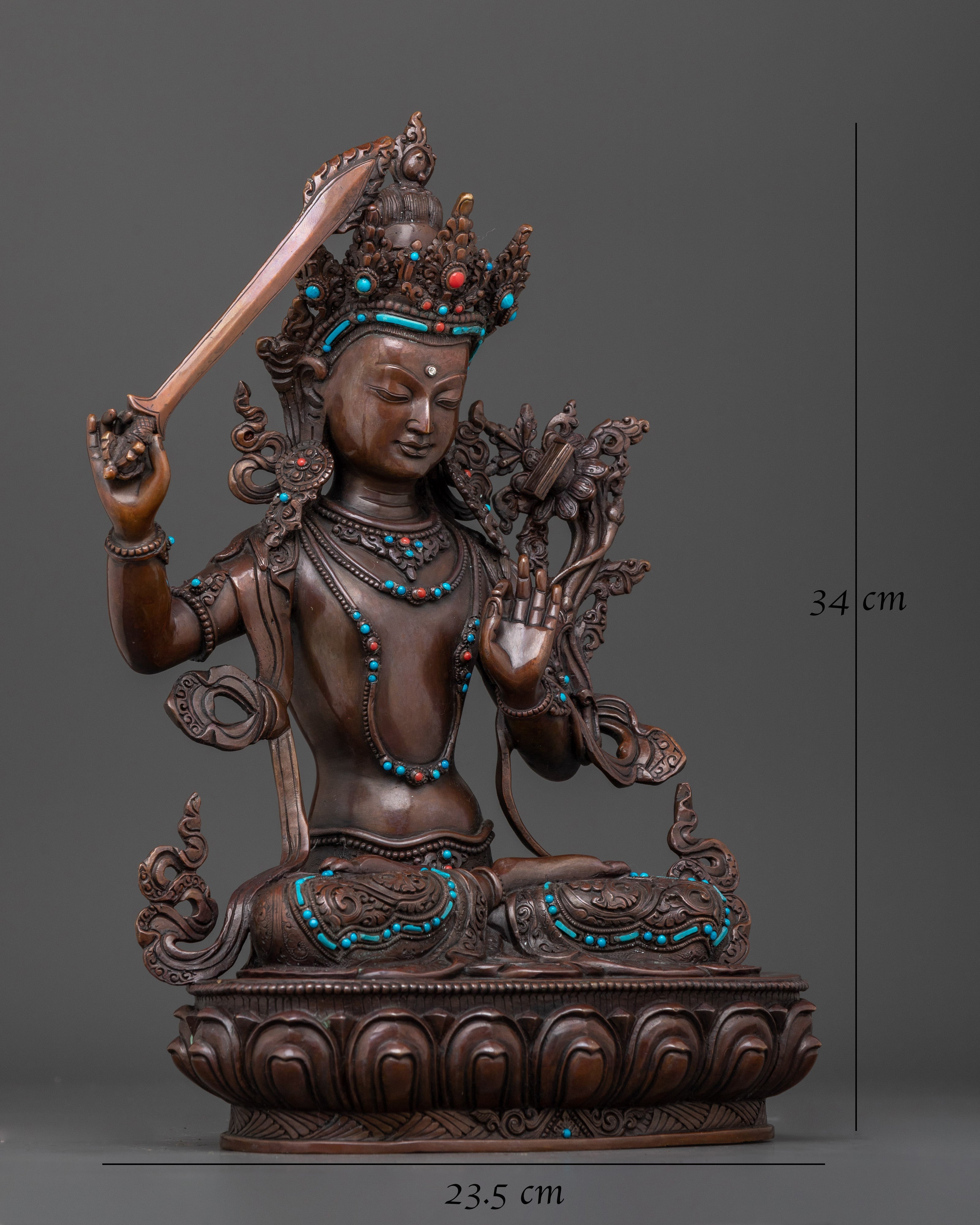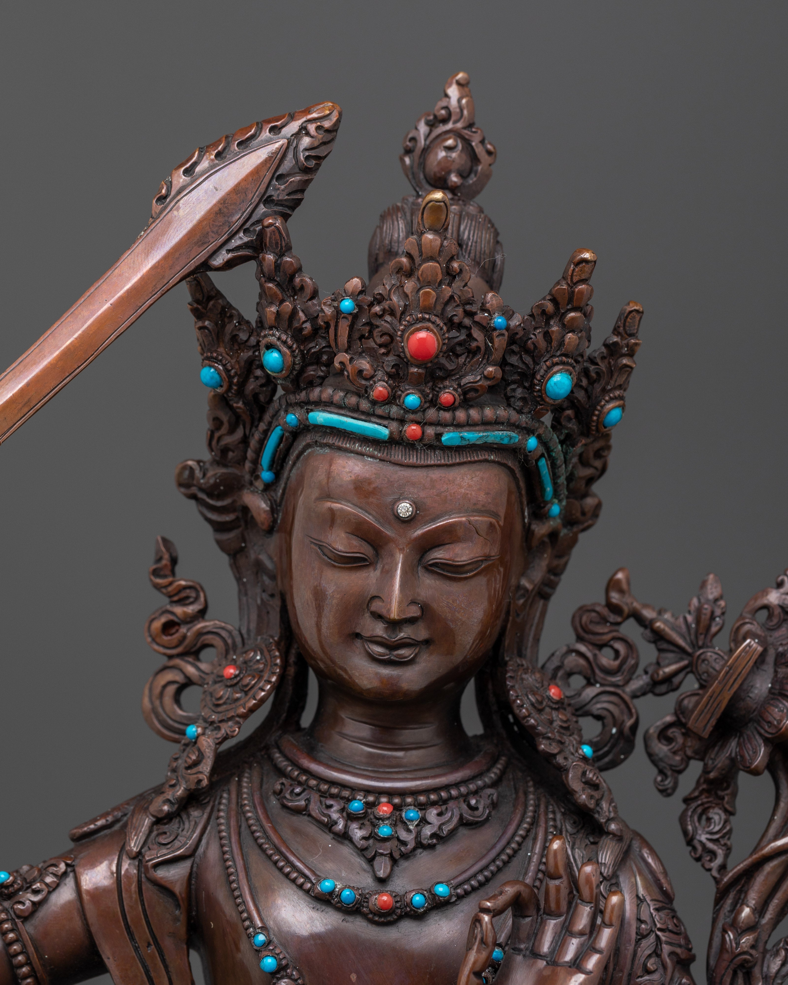 This Manjushri Wisdom God statue, finely carved from oxidized copper and studded with gemstones, captures the deity's tranquil yet strong essence. The flawless finish lends the statue an old appearance, emphasizing its spiritual value and creative skill. Manjushri's meticulous details, from his peaceful demeanor to the gemstone embellishments, reflect his status as the embodiment of wisdom.