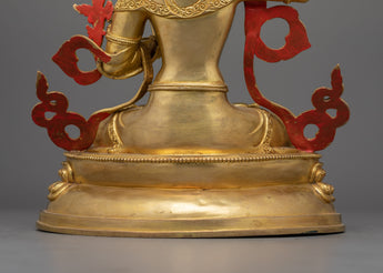 Manjushri, the Bodhisattva of Wisdom, is represented here in a seated position, radiating calm and clarity. On the one hand, he wields his renowned flaming sword, indicating the ability to cut through ignorance, while on the other, he carries the Prajnaparamita Sutra, which represents ultimate wisdom. His tranquil demeanor and intricate decorations represent his duty as a counselor to enlightenment. This statue, rich in symbolic components, serves as a powerful reminder of wisdom's transformative potential and would make an excellent addition to any collection or meditation space.