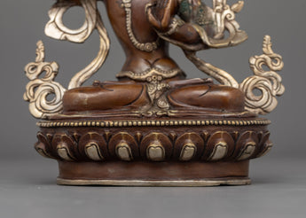 The deity is depicted seated over a moon disc lotus with a peaceful expression while he holds the sword of wisdom above his head and the book of knowledge lies in a blooming lotus. The deity is decorated with numerous body ornaments which have been embedded with precious gemstones. A perfect figure for those who are seeking the path of wisdom, this Manjushri statue will inspire clarity, focus, and the cultivation of deep insight.