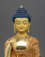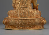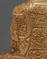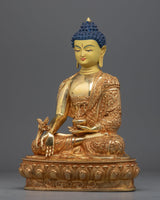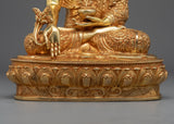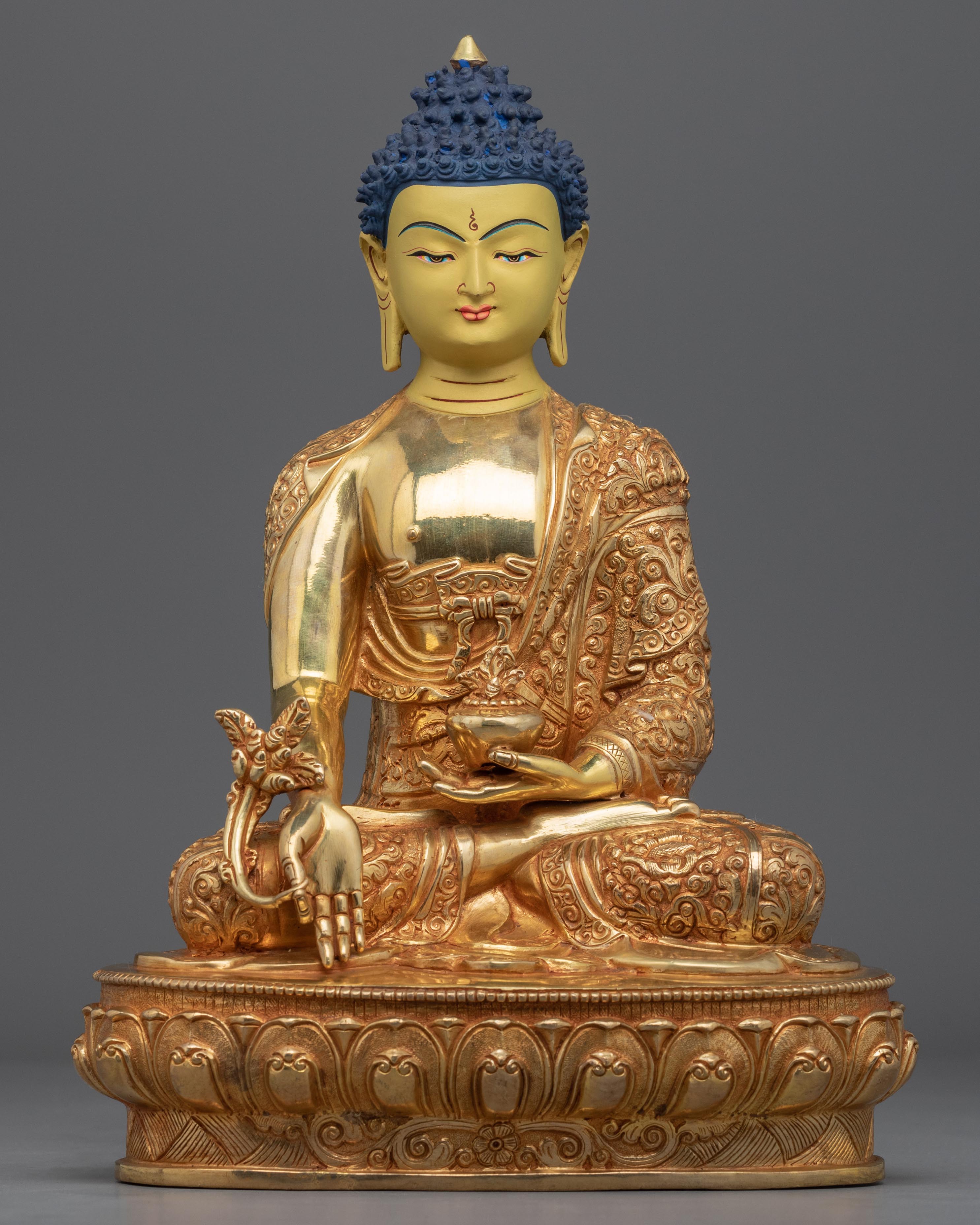 Kathmandu Valley artisans expertly created the exquisite Medicine Master Buddha Statue in the traditional Himalayan style. The statue has a luxurious and elegant appearance because it is made of copper and is gilded with real 24k gold. The statue shows the Medicine Buddha in a contemplative position, holding the "great medicine"—the myrobalan plant—in his right hand while making an earth-touching gesture with his left hand. The statue's overall beauty is enhanced by the hand-carved, intricately patterned robe, lotus seat, and other details. The intricate craftsmanship of this statue makes it the ideal addition to any meditation or yoga practice and the ideal gift for a Buddhist or yoga practitioner.