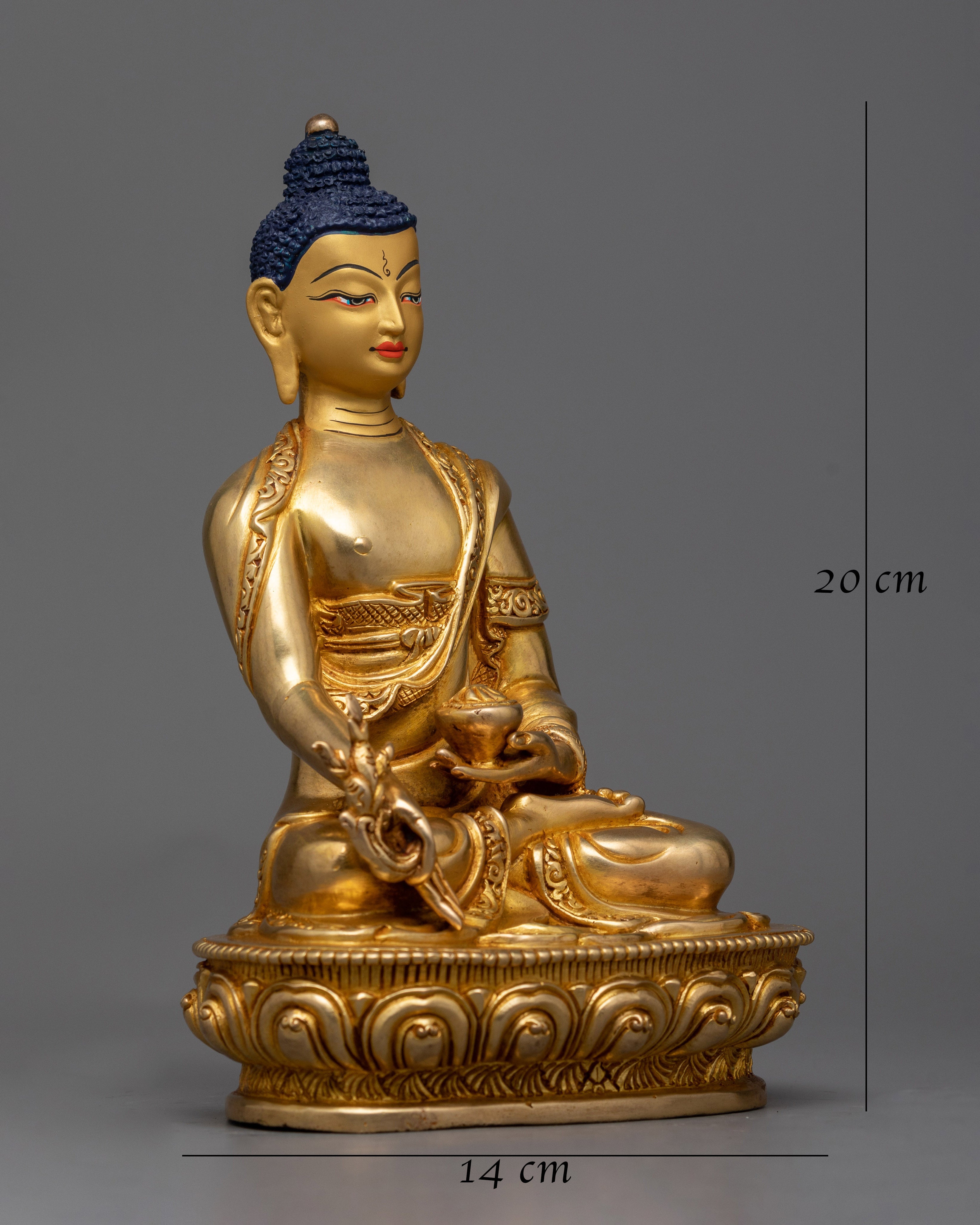 The Menla Sangay "Medicine Buddha" Sculpture is a profound representation of the Buddhist deity of medicine and health. With it, you can discover the sanctuary of healing and compassion. This sculpture, which stands at a graceful height of 7.8 inches and rests on a 5.5-inch base, weighs 1.23 kg and represents the fundamental aspects of physical and spiritual healing. This sculpture, which is made of a sturdy copper body and is embellished with 24K gold gilding and painstaking acrylic and gold paints, perfectly embodies the calm and caring nature of Menla Sangay, the Medicine Buddha.