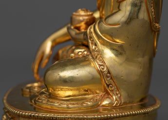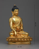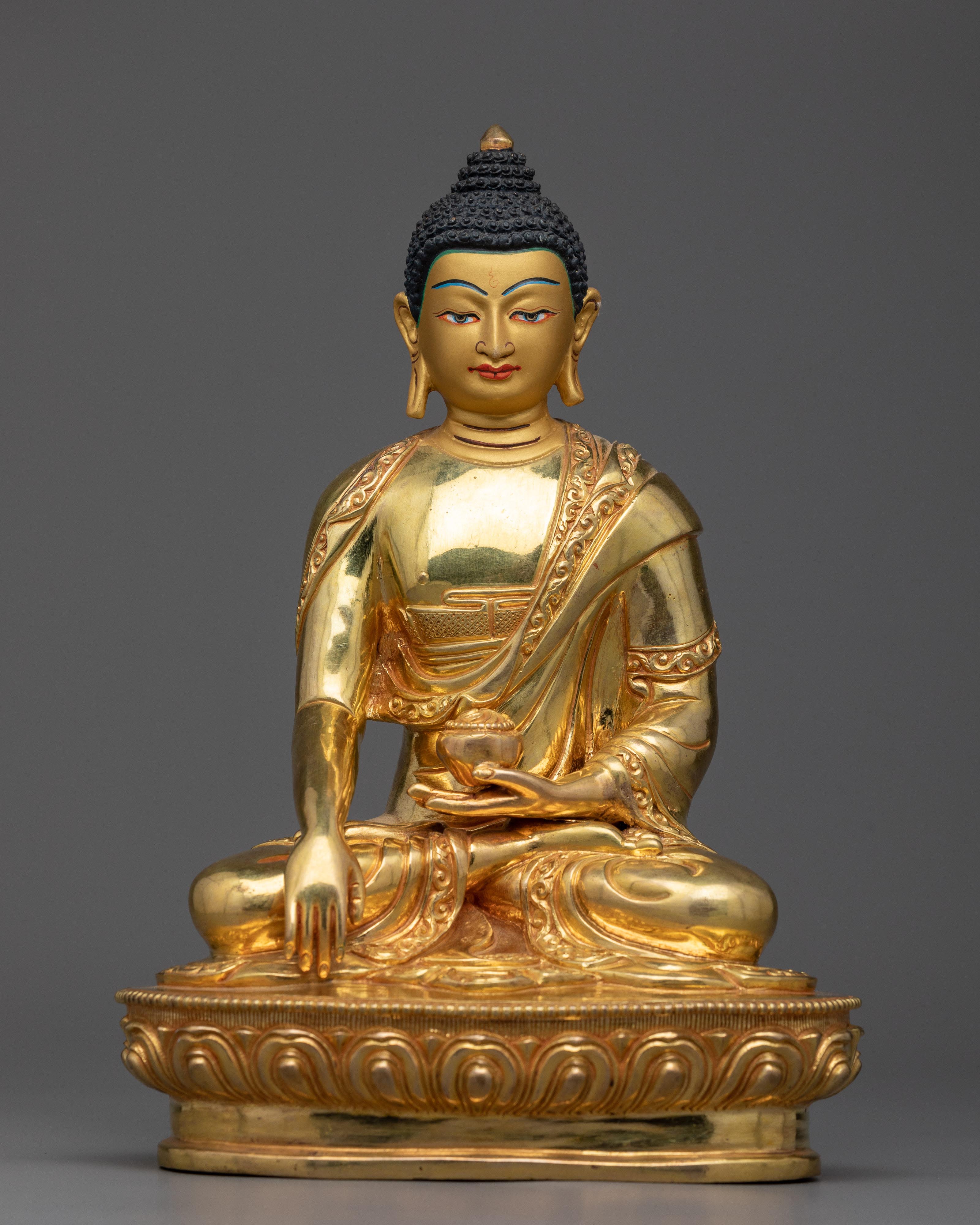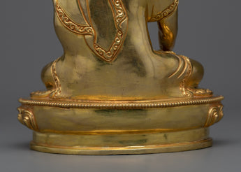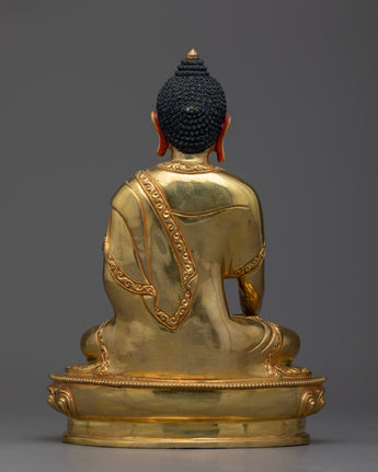 Pay reverence to the enlightened one with this Namo Buddha Shakyamuni Statue. This magnificent work of art is made with a copper body. It is embellished with delicate acrylic paints and 24k gold plating, which measures 7.8 inches in height and rests on a sturdy 6.2-inch base, personifying Buddhism's compassion and wisdom. Feel a strong connection to the history of spiritual enlightenment as you study the beautifully sculpted details of this statue.