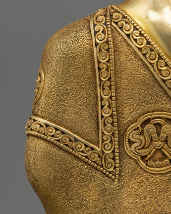 The Nirghosharaja Medicine Buddha statue stands at 10.6 inches (27 cm) in height with a base width of 8.1 inches (20.5 cm). Crafted from a solid copper body, this statue is adorned with 24K gold gilding and detailed with gold and acrylic paintings, showcasing the exceptional artistry of traditional Himalayan craftsmanship.