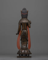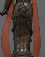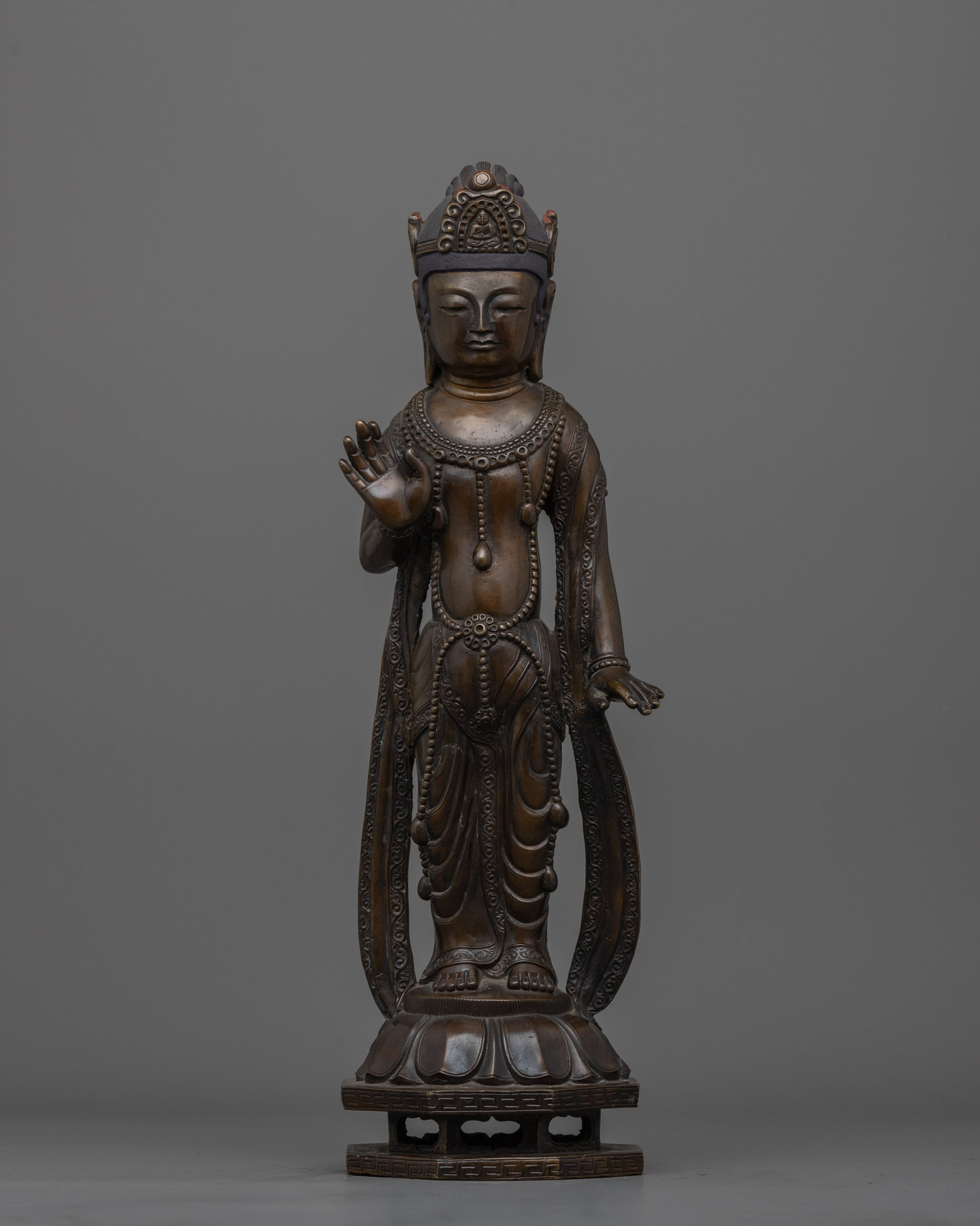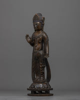The Bodhisattva is shown in an elegant pose, exuding serenity and tranquillity, with a serene countenance and elaborate robes that symbolize the purity and wisdom of the enlightened path. The statue's superb craftsmanship and oxidized finish provide a profound sense of calm, making it an effective focal point for meditation and spiritual practice.