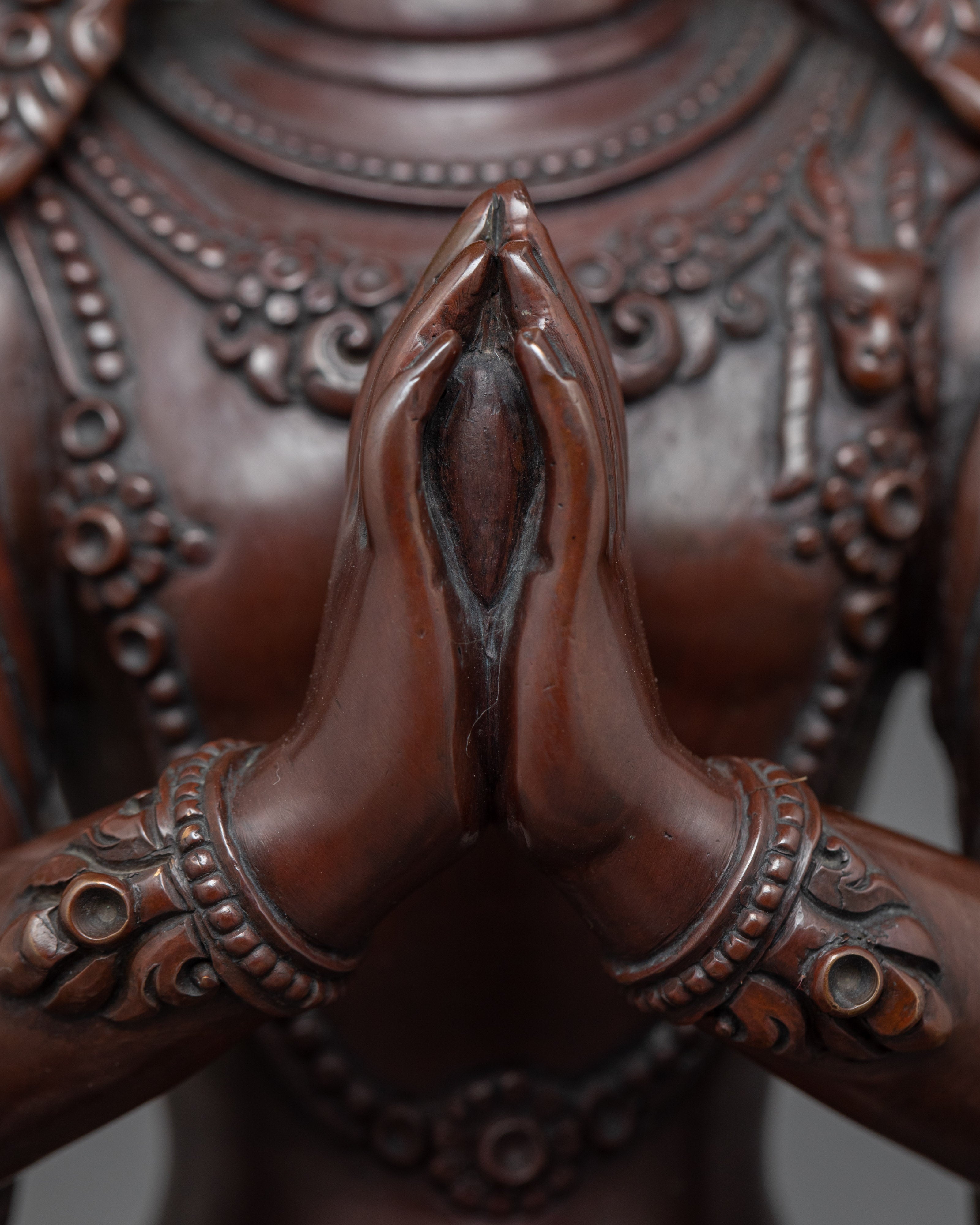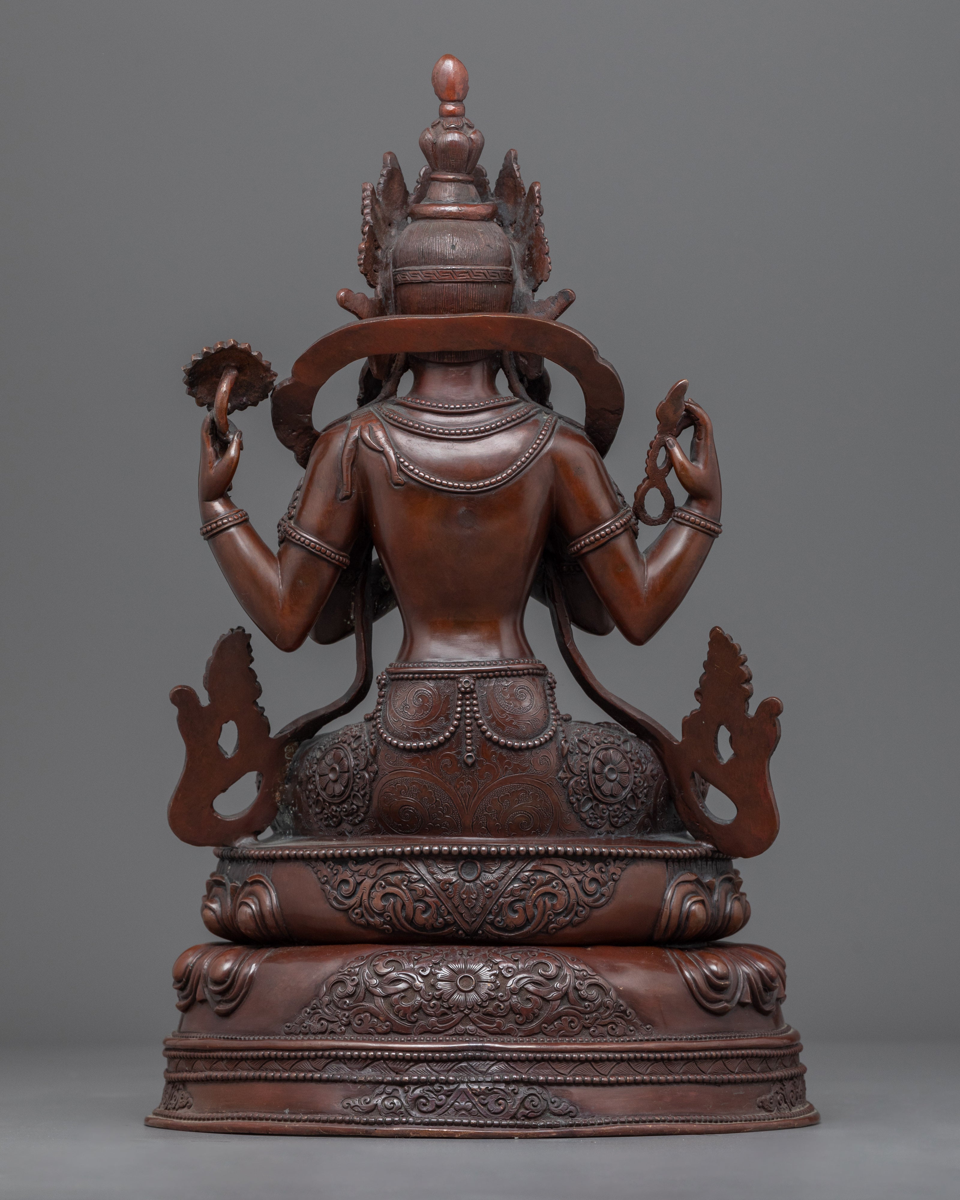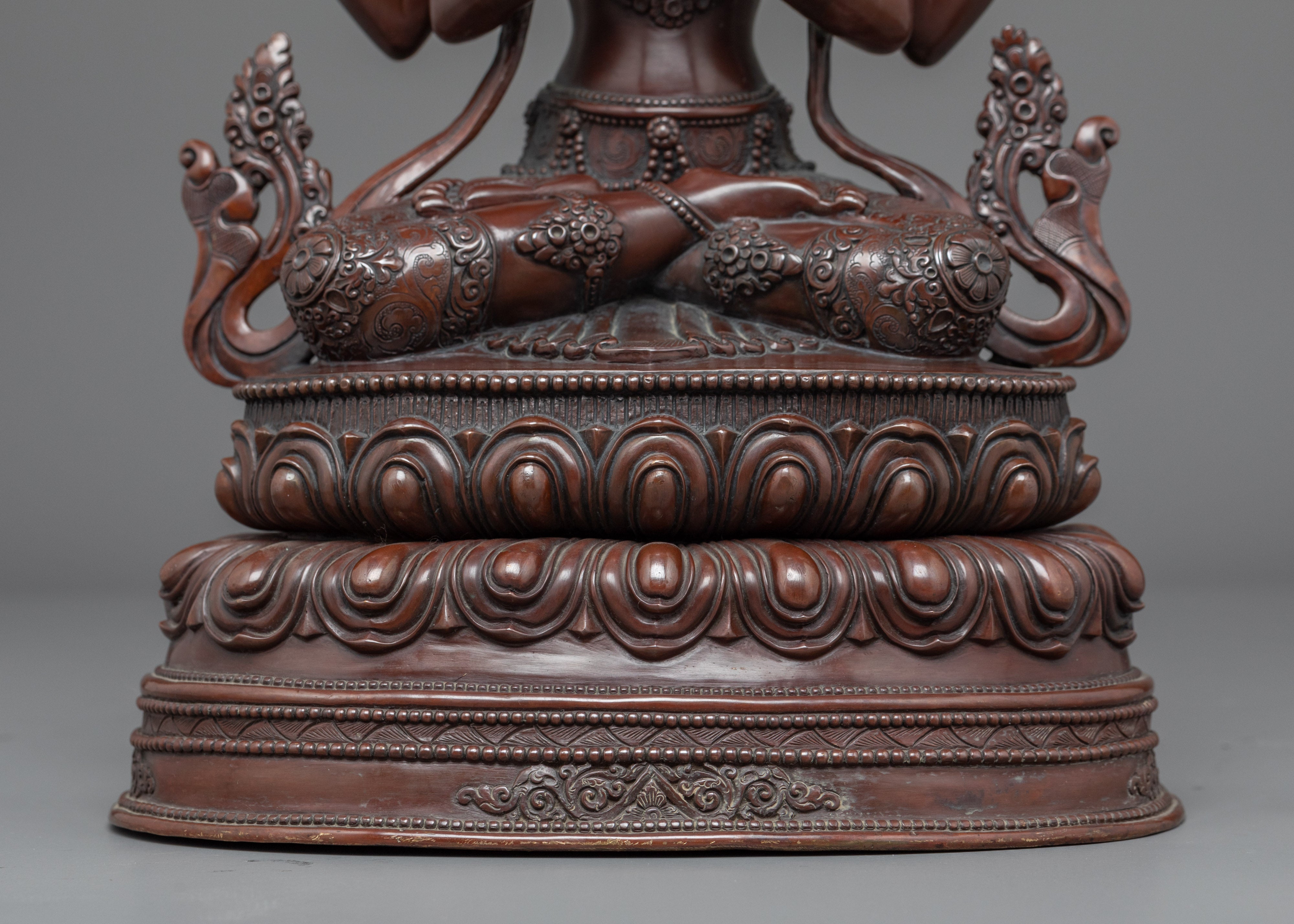Handcrafted with traditional Himalayan patterns, the Bodhisattva Avalokitesvara Statue is an exquisite piece of art native to the Himalayan Buddhist artistry. It is made out of oxidized copper with intricate carvings and motifs. The Bodhisattva is depicted with four arms in the statue, here the first pair of arms portray the 'Anjali mudra' representing praying and adoration, while the second pair holds rosary beads and a full bloomed lotus on right and left respectively. A khata is worn over the Bodhisattva's body along with other body ornaments as he sits atop the moon disc lotus with a tranquil expression.