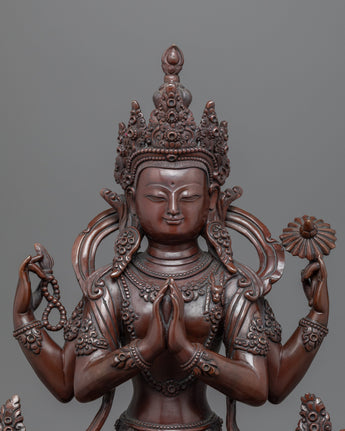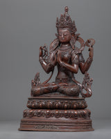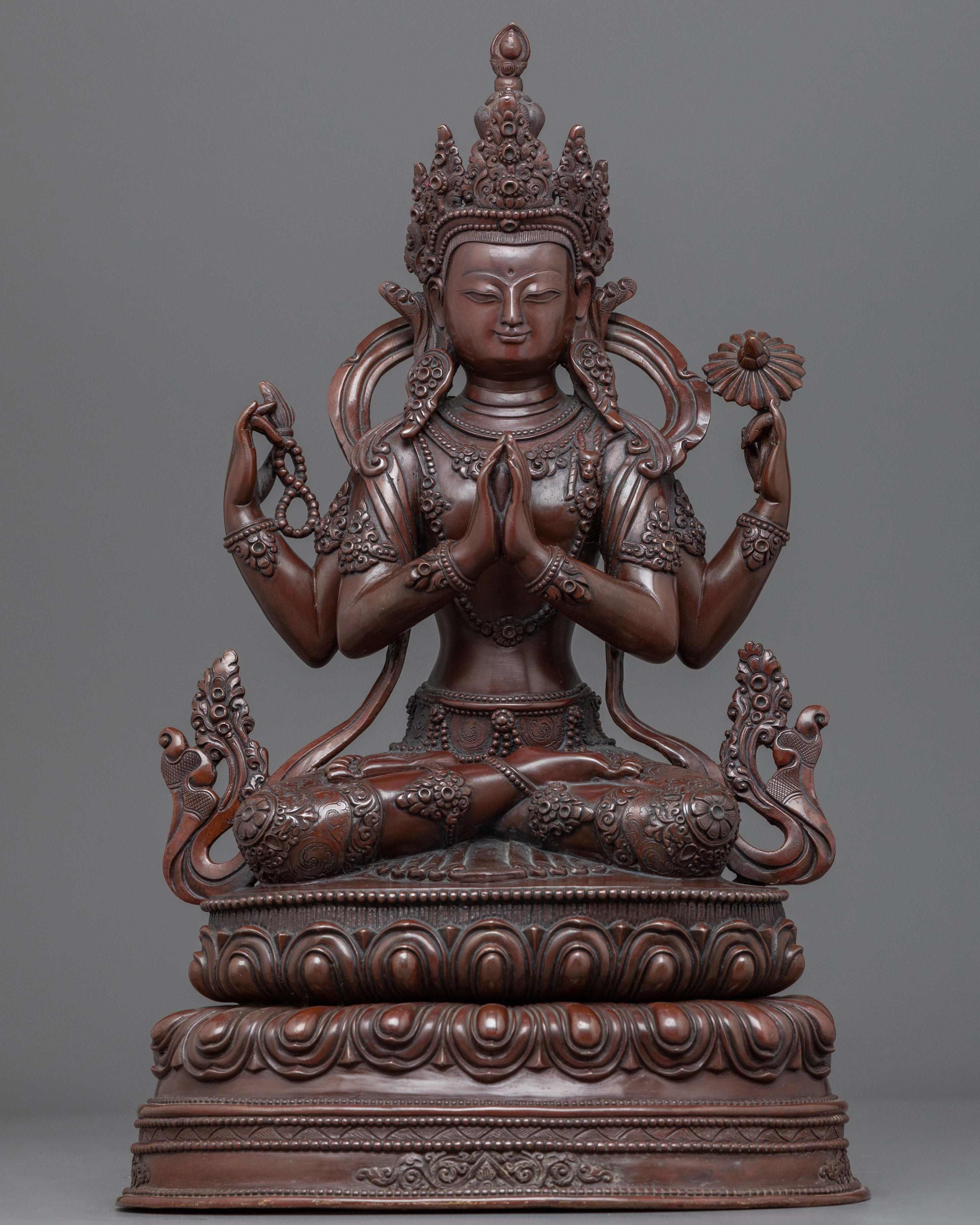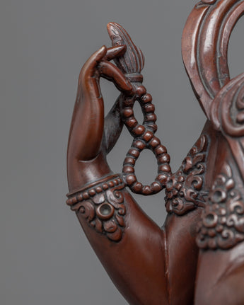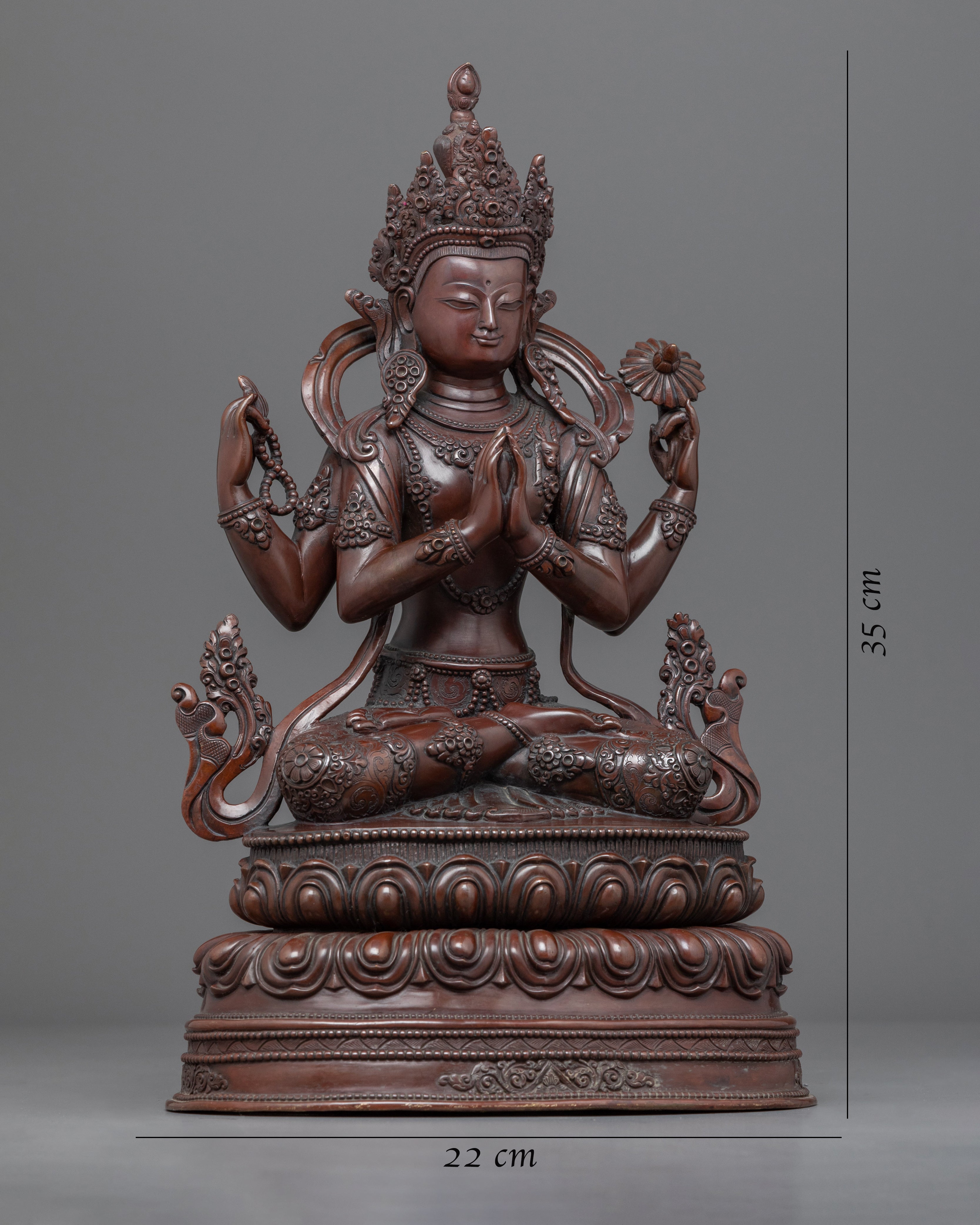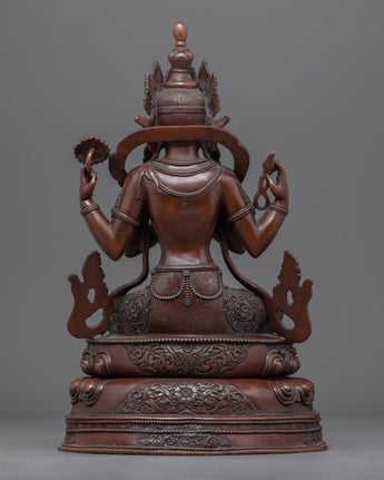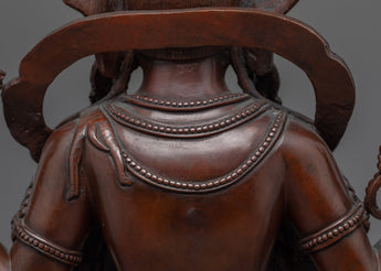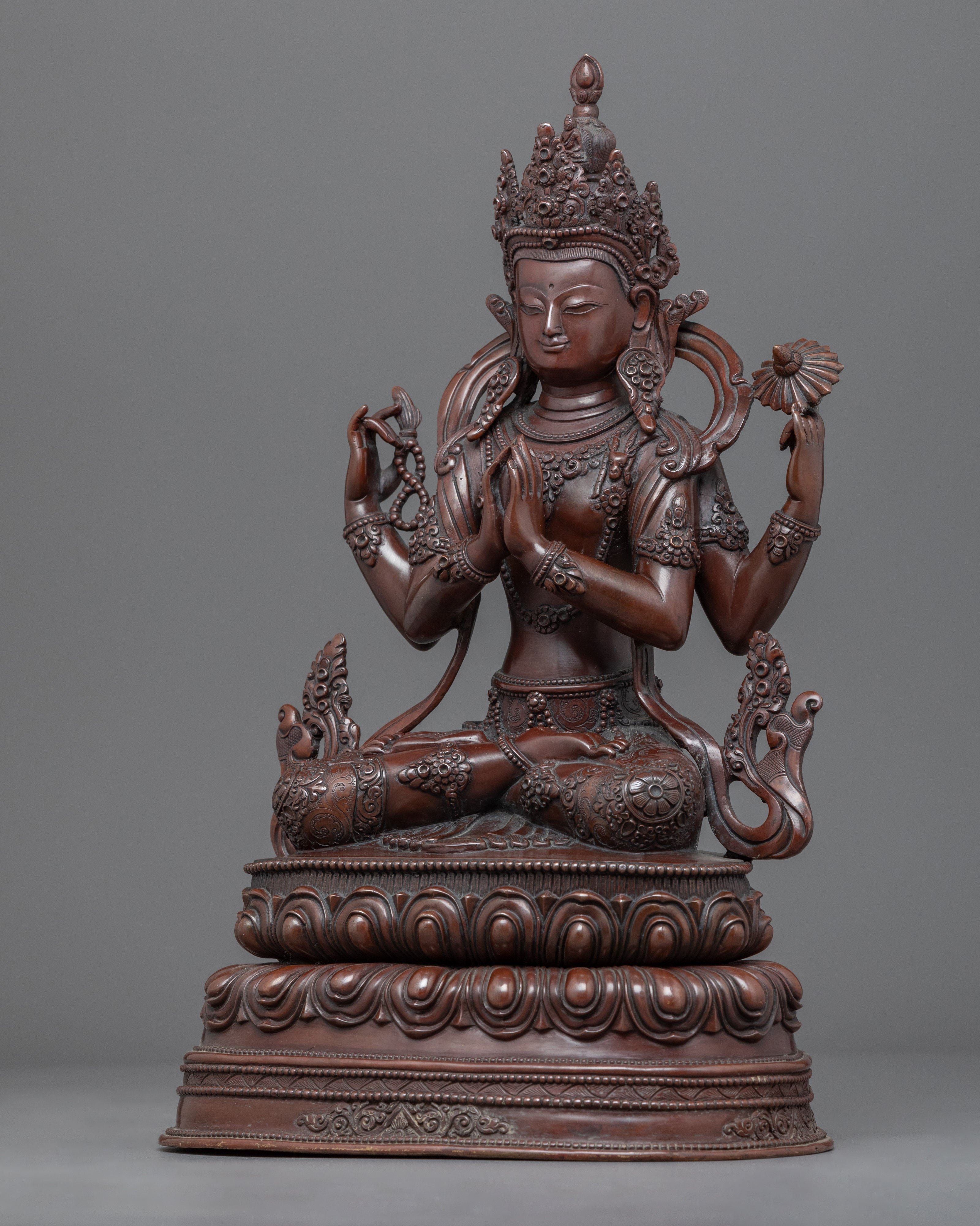 Handcrafted with traditional Himalayan patterns, the Bodhisattva Avalokitesvara Statue is an exquisite piece of art native to the Himalayan Buddhist artistry. It is made out of oxidized copper with intricate carvings and motifs. The Bodhisattva is depicted with four arms in the statue, here the first pair of arms portray the 'Anjali mudra' representing praying and adoration, while the second pair holds rosary beads and a full bloomed lotus on right and left respectively. A khata is worn over the Bodhisattva's body along with other body ornaments as he sits atop the moon disc lotus with a tranquil expression.