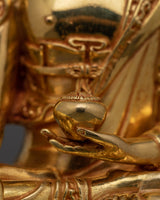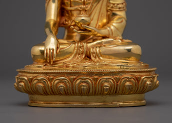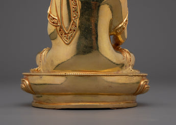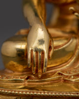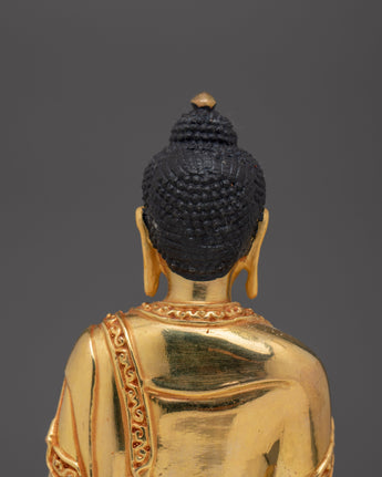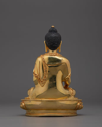 This Present Seed of Enlightenment statue of Shakyamuni Buddha is a powerful symbol of peace and spiritual enlightenment. Standing at 6.3 inches (16 cm) tall and weighing 0.66 kg, carved from copper and gilded in 24K gold.