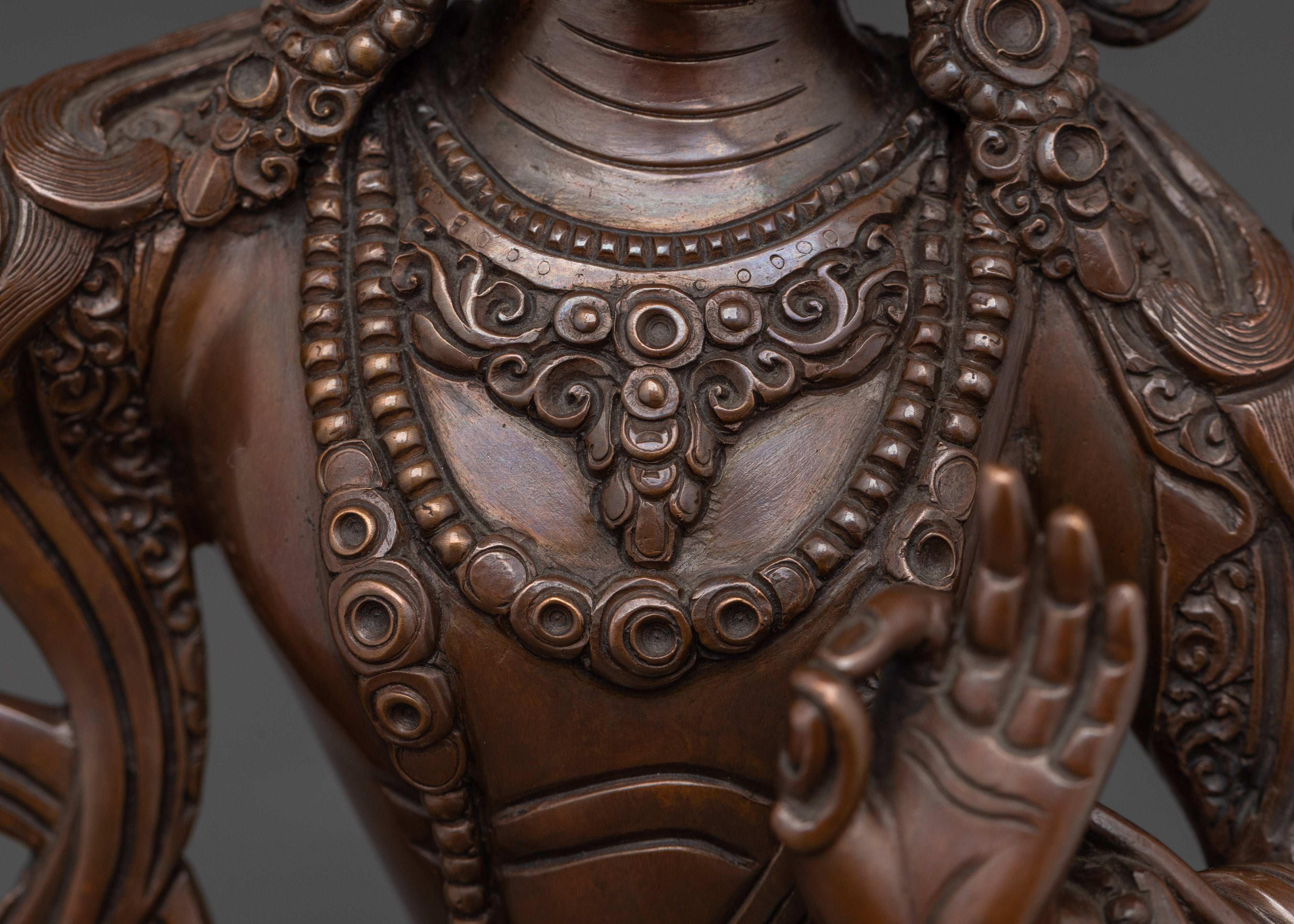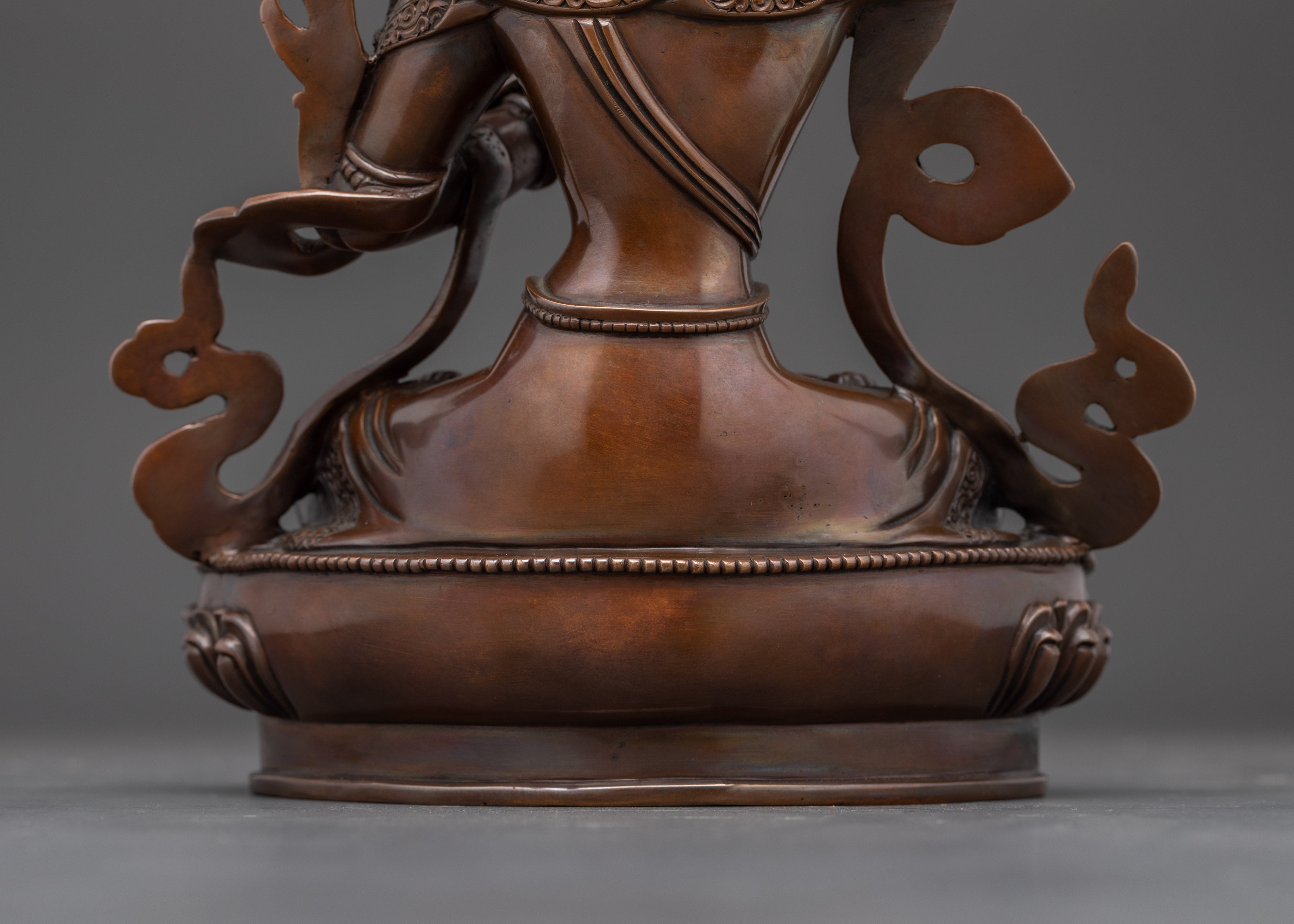 This figurine's craftsmanship and intricate artistry are highlighted by its unique, vintage appearance, which is created by a copper body. Manjushri's peaceful countenance, flowing garments, and elegant stance are all painstakingly crafted to capture the spiritual essence and conventional iconography of this adored Bodhisattva.