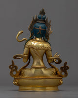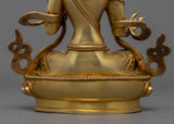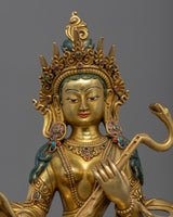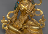 We have exquisitely hand-sculpted the Saraswati Goddess Statue in a traditional Himalayan style made in Nepal. The deity is depicted with a vina in her hand and seated on a lotus with a peaceful expression. We have molded the statue using copper and glided it with genuine 24K gold. The crown and the body ornaments are embellished with precious gemstones. It took us months and months of hard work, from molding to hand-craving intricate design patterns and gliding with gold in our studio. We assure you that the materials used for the statue are of the highest quality.