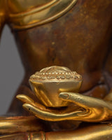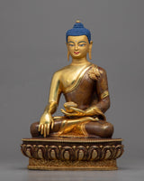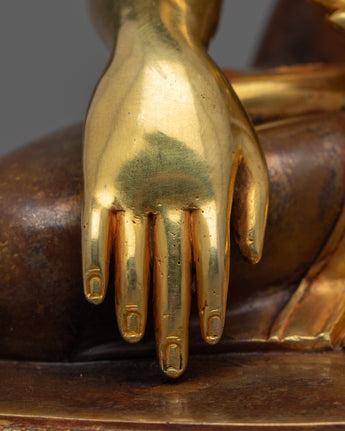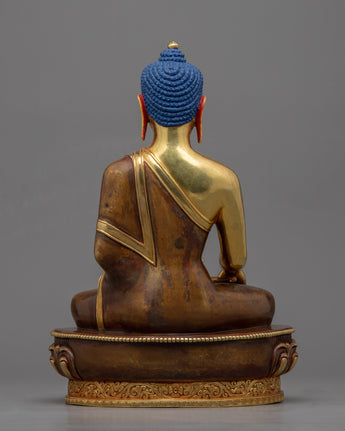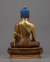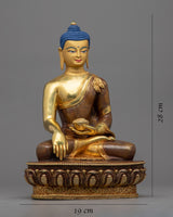This stunning Shakyamuni Buddha statue is a true representation of the Buddha's peaceful and serene countenance, captured beautifully in this oxidized copper figure that is gilded in gold, adding an air of antiquity to the piece. The Buddha is depicted seated in a lotus position on a moon disc lotus, with his right hand holding an alms bowl over his lap, a symbol of his detachment from material possessions. His left-hand forms the Bhumisparsa Mudra, which represents the moment of his enlightenment as he claimed the earth as his witness. The intricate details of the statue showcase the Buddha's calm expression, radiating a sense of inner peace and wisdom.