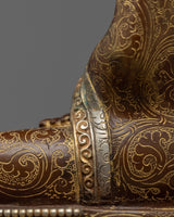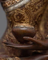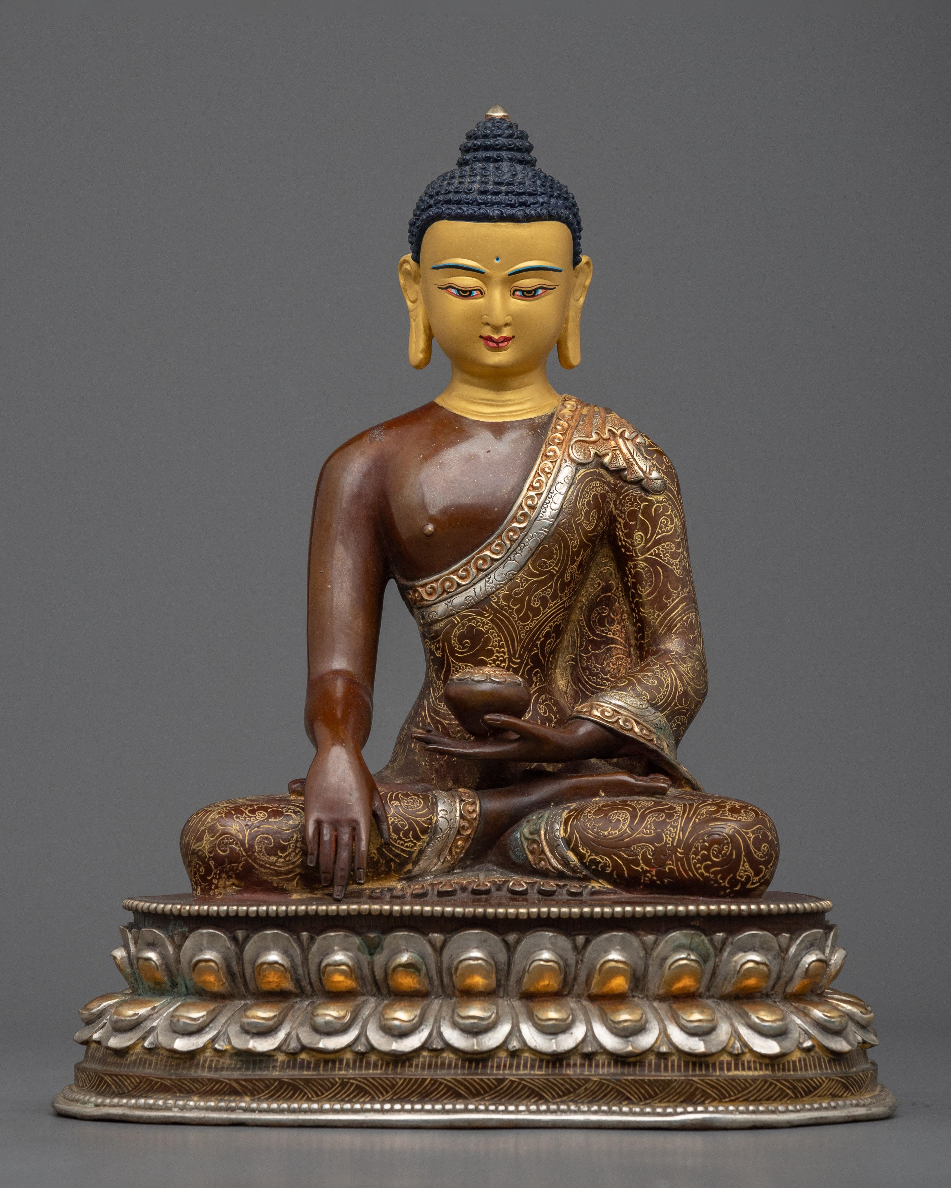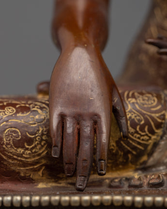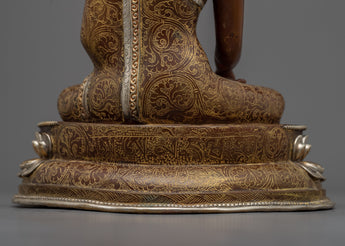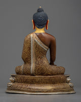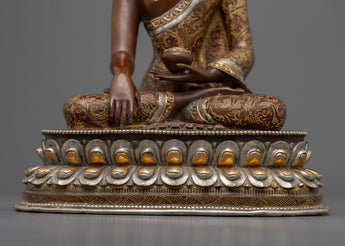 Our Shakyamuni Buddha Statue Art captures the serene aura of the Enlightened One. This magnificent item, expertly handcrafted from an oxidized copper body and embellished with silver plating, 24k gold, and careful acrylic paints, demonstrates the extraordinary talents of Nepalese artisans.