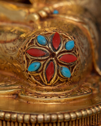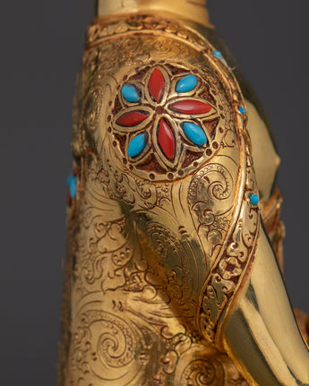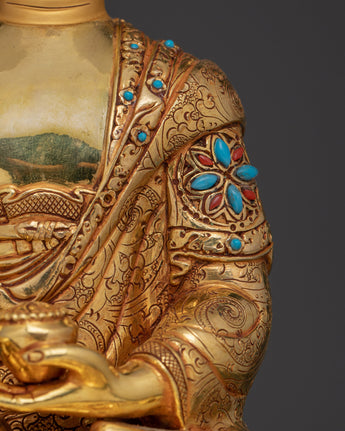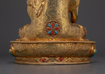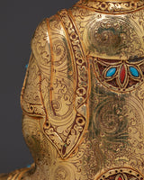 The Shakyamuni Buddha The Teacher of Dharma statue is handcrafted from copper and embellished with 24K gold gilding and gold and acrylic paintings, giving it a divine air. The inclusion of hand-carved gemstones accentuates the elaborate design, representing the Buddha's knowledge and compassion. With a height of 9.4 inches (24 cm) and a base width of 6.7 inches (17 cm), this stunning piece of art weighs 1.91 kg and is ideal for display on a Buddhist altar, meditation room, or as part of your spiritual home decor.