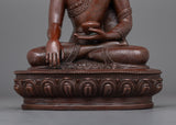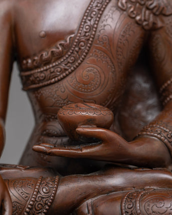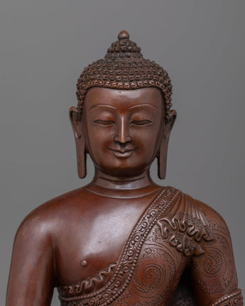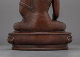 This Tranquil Enlightened Teacher Statue embodies the calm core of Shakyamuni Buddha's teachings. This statue is a handcrafted masterpiece from Patan, Nepal which demonstrates the amazing ability of local artisans. Shakyamuni Buddha statue stands 11.0 inches tall, with an 8.3-inch base width, and weighs 3.04 kg, is handcrafted from oxidized copper. Its shape and profound meaning make it a symbol of spiritual peace and enlightenment.