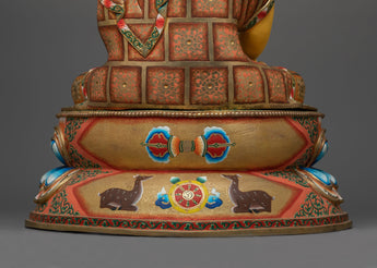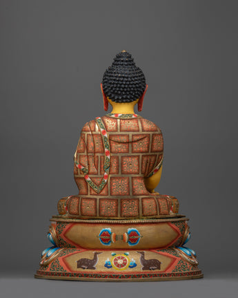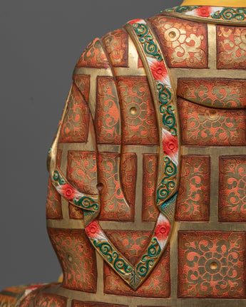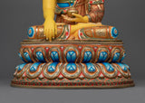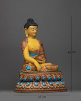 With skill and attention to detail, the artisans have produced a work that showcases traditional methods and fine craftsmanship. Fewer paint is used on the statue—dim red, orange, blue, and green—but the contrast between it and the gold gilding is still dramatic. This statue of Shakyamuni Buddha is more than just a decorative item; it represents inner serenity and spiritual development profoundly. Its elaborate design and yellow-hued finish accentuate its presence and bring the blessings of wisdom and tranquility into your home or shrine. This work is a journey companion and a reminder of spiritual richness.