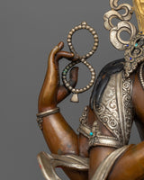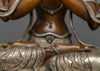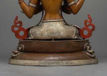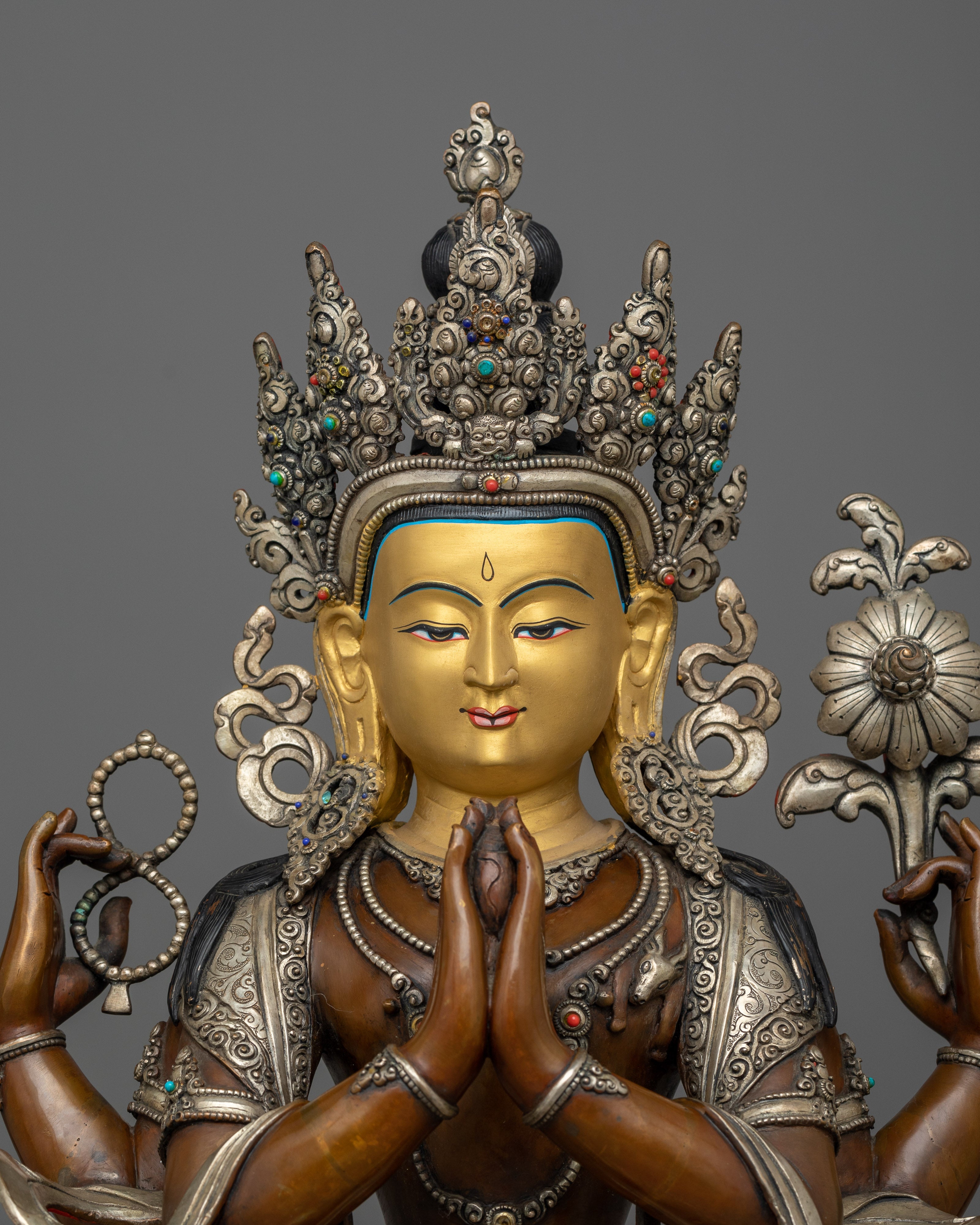 The Radiant Silver-Plated Chenrezig Statue is the epitome of craftsmanship and spiritual symbolism; it will elevate your spiritual practice. With its angelic aura and kind demeanor, this majestic statue, standing tall at 20.08 inches, attracts attention and provides comfort and motivation to those pursuing enlightenment. Each Chenrezig statue is carefully handcrafted from oxidized copper, flawlessly plated in silver, adorned with gold-painted accents, and honored with a beautiful crown. It is a living embodiment of the ageless teachings of Mahayana Buddhism, beckoning seekers to embrace the transformative power of wisdom and compassion.