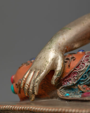 Bring the profound wisdom and serenity of Shakyamuni Buddha into your sacred space with this elegantly crafted silver-plated statue. Handcrafted in the historic city of Patan, Nepal, this statue is a testament to the meticulous skill and dedication of Nepali artisans, renowned for their centuries-old tradition of metalworking. This depiction of Shakyamuni Buddha, with its serene and meditative posture, serves as a powerful symbol of spiritual awakening and inner peace.