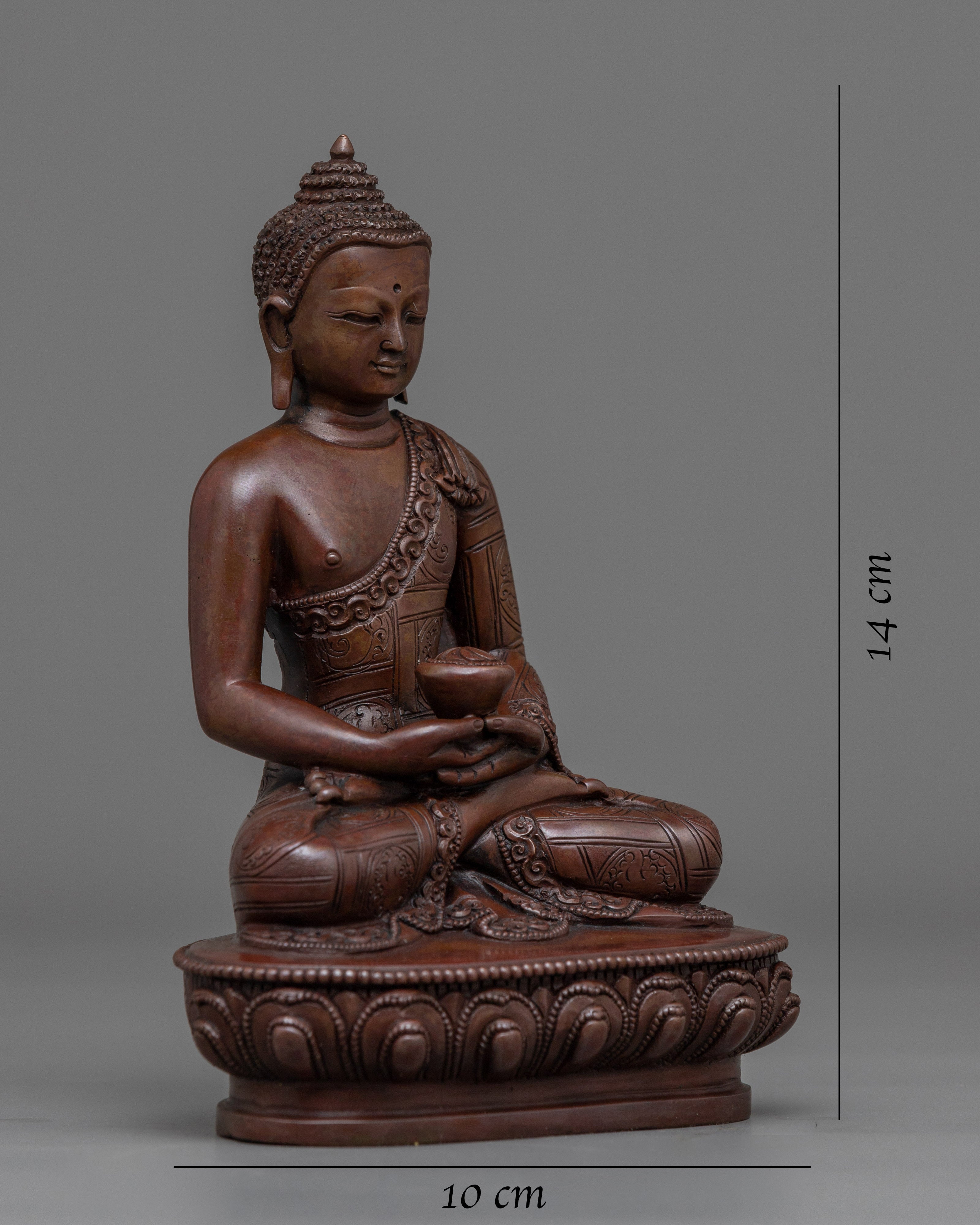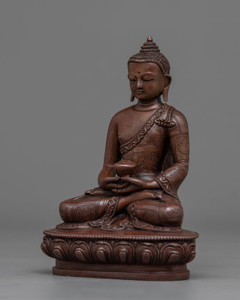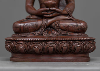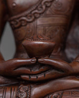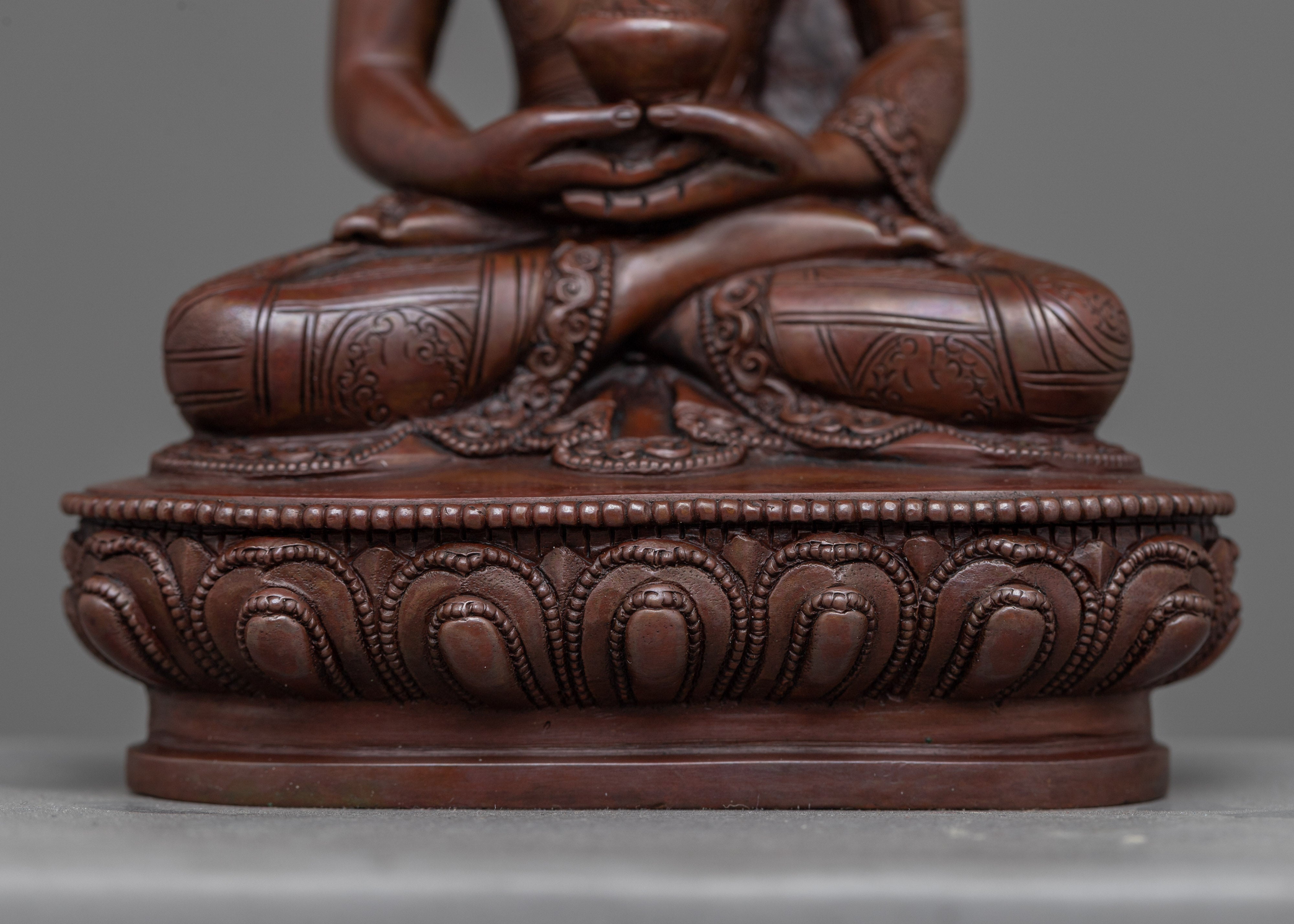 Handmade by skilled Nepali Artists whose craftsmanship was passed down to us for generations. The statue was crafted on a copper alloy, hand-carved in intricate details. Amitabh Buddha Statue holds an eternal Life Nectar Vase with both of his hands on his lap. The Infinite Life Buddha's serene visage in the statue is seated in a vajra stance on a lotus seat.