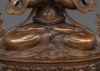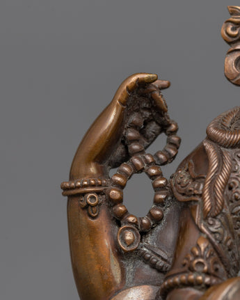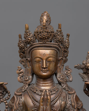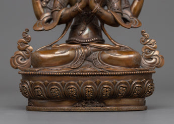 The small Chenrezig Statue crafted from an oxidized copper body is a classic depiction of the Bodhisattva of Compassion, Avalokiteshvara. It is the perfect addition to small altars, personal meditation areas, or as a thoughtful present for people on a spiritual path, standing 8.7"/22 cm tall and weighing 1.64 kg.