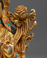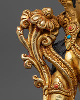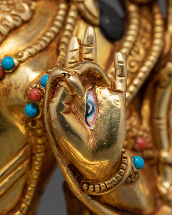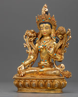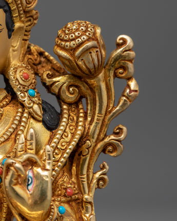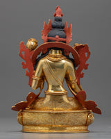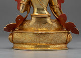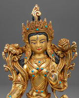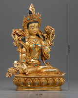 This small White Tara statue a female Bodhisattva was created by Nepal's finest artisans using ancient techniques in our studio, Kathmandu, Nepal. This exquisite work of art was created with a copper body and gilded with 24-karat real gold. The deity sits serenely on a moon disc lotus, holding an utpala in her left hand and her right hand. The acrylic painting draws attention to the statue, giving it a more captivating appearance. To denote her status, the deity is adorned with beautifully hand crafted body jewelry encrusted with various semi-precious gemstones and regal garments.