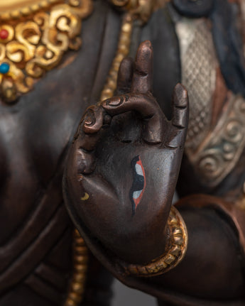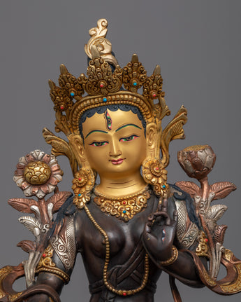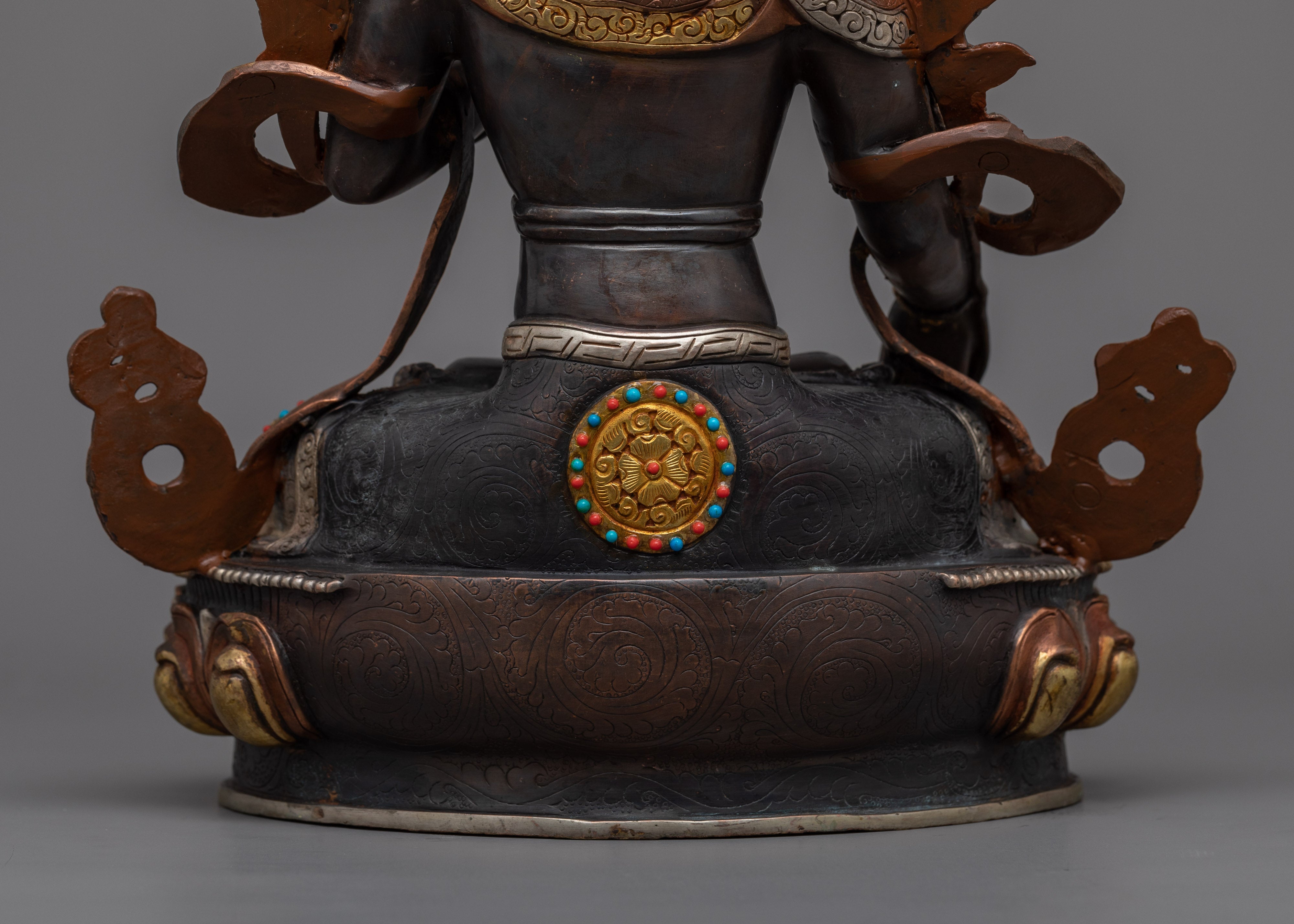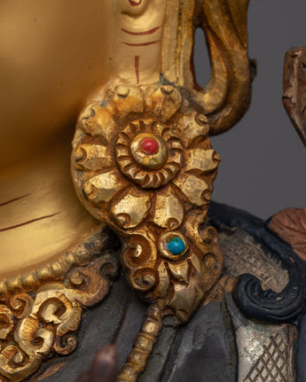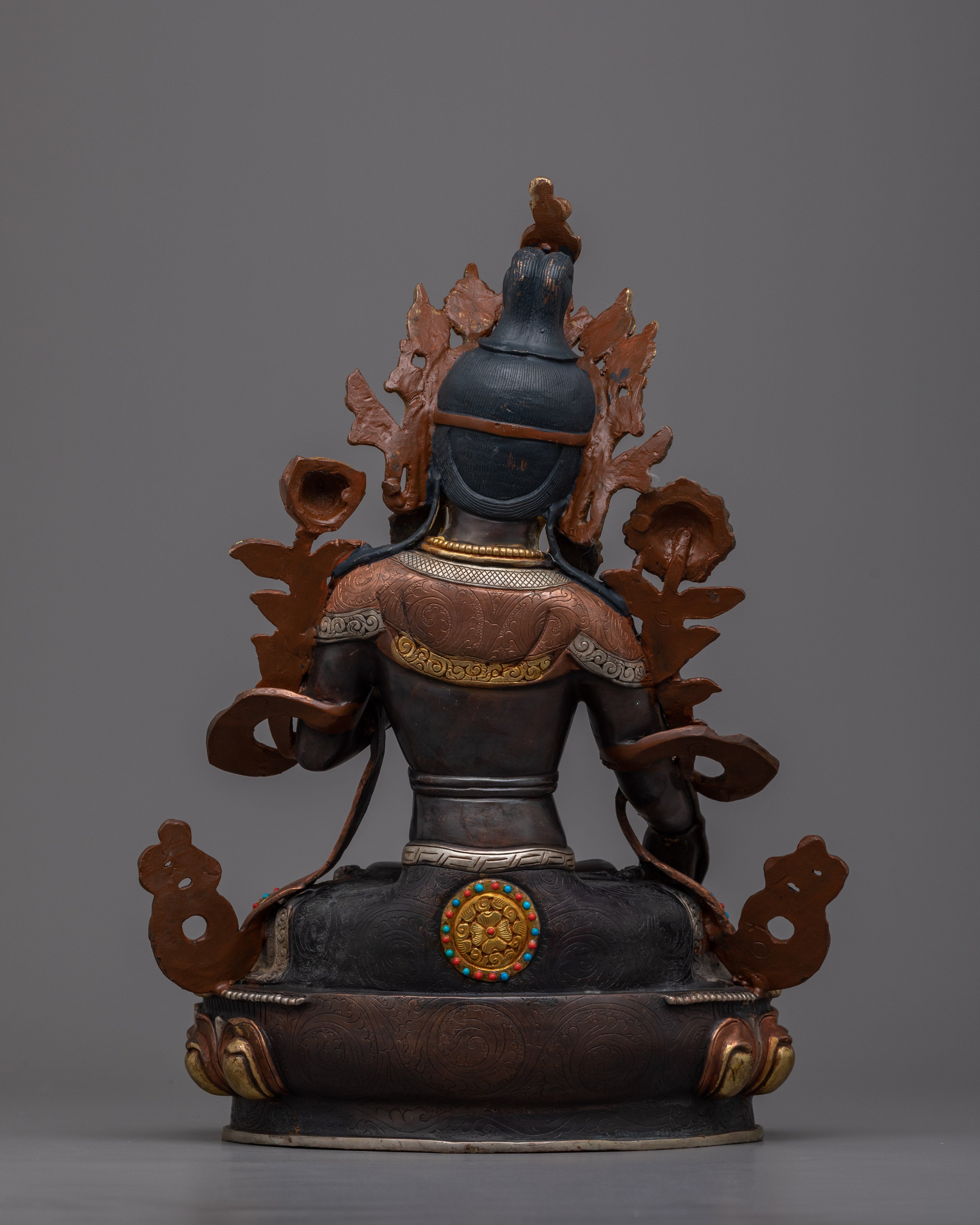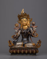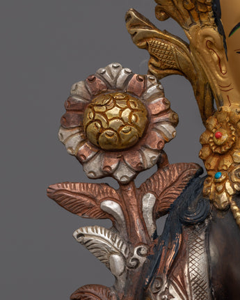 This magnificent statue, which is 13.3 inches tall and 10.2 inches in diameter, has a body made of 24K gold-gilded copper, giving it a rich and sophisticated appearance. The statue's beauty is enhanced by the beautiful acrylic paints, and its expertly created design displays White Tara's elegance and serenity. This statue, which weighs 3.79 kg, is ideal for people looking to instill a sense of tranquility and compassion in their homes or meditation areas.