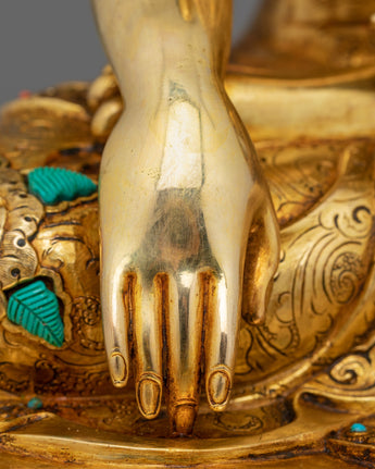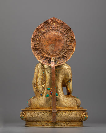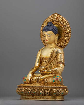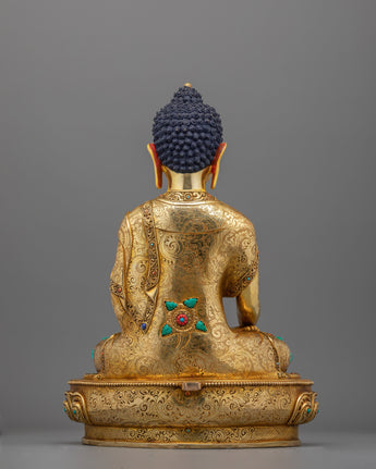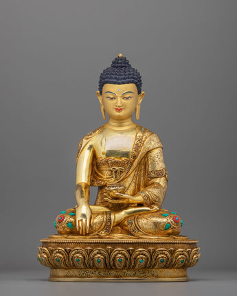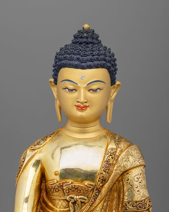 This Shakyamuni Buddha, also known as "The Awakened One," radiates calm and profound knowledge, embodying the essence of enlightenment and compassion. This sculpture measures 16.3"/41.5cm (Height) x 9.6"/24.5cm (Base) and weighs 5.78 kg. It is precisely created from a 24K gold-gilded copper body with gold and acrylic paints, demonstrating craftsmanship.