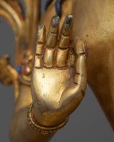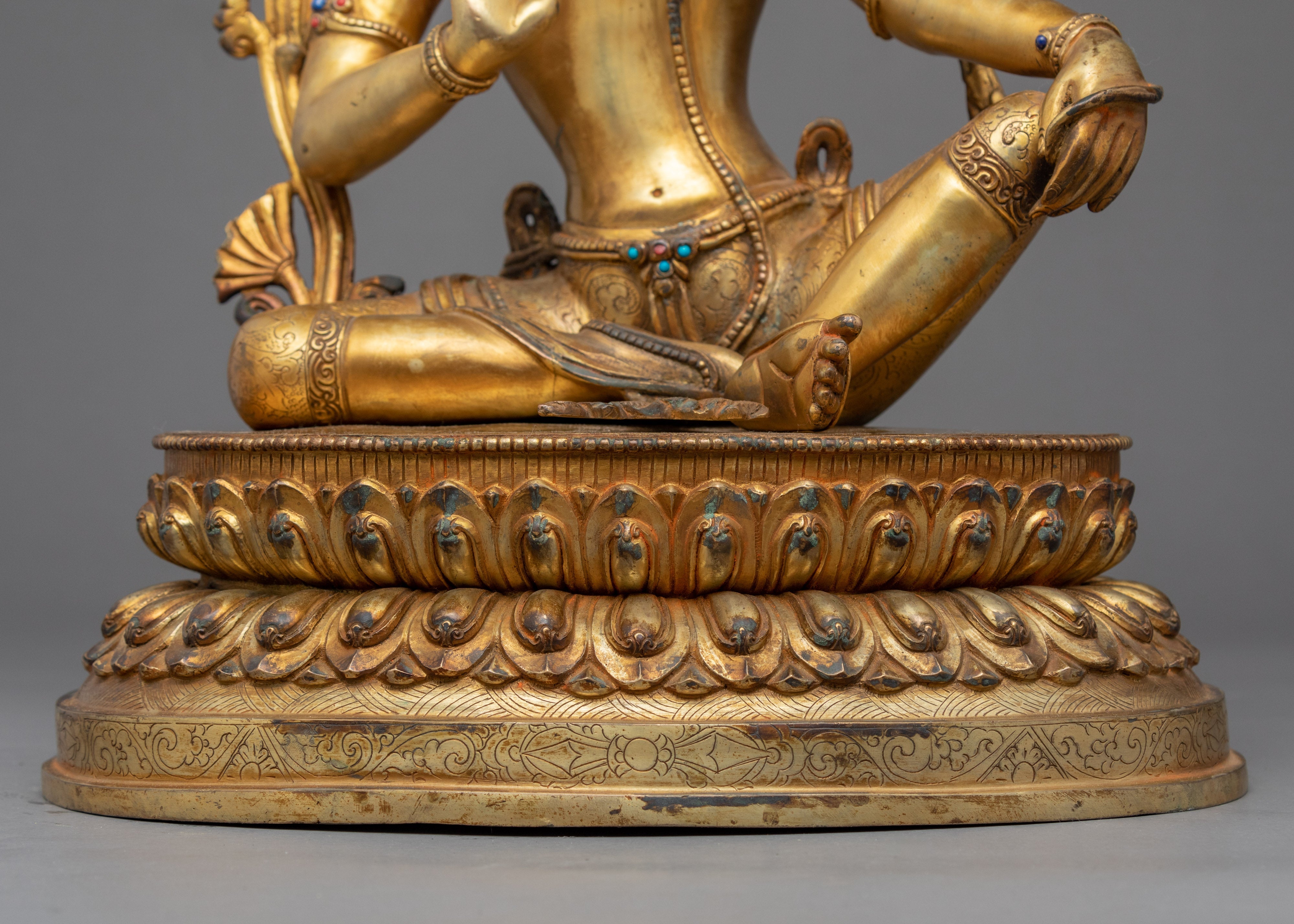 We have exquisitely hand-sculpted the Buddha Of Wisdom Sculpture in a traditional Himalayan style made in Nepal. We are the artisans of the Kathmandu Valley, whose knowledge of creating traditional Vajrayana sculptures has been handed down over the years. The Manjushri is depicted in the statue in a relaxed body posture while sitting on a moon-disc lotus seat. Here the deity places his left hand on the knee holding a lotus stem while his right hand does the vitarka mudra. Turquoise and priceless stones have been used to embellish the crown and body ornaments such as necklace, earrings, and bracelets. It took us more than a month to complete the artcraft from construction to polishing of the statue since we hand-carved the statue's pure copper body and gilded it with pure 24 karat gold. We have given the statue antique finish which makes it even more appealing.