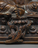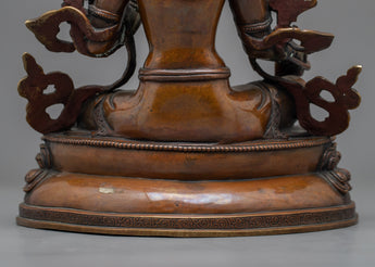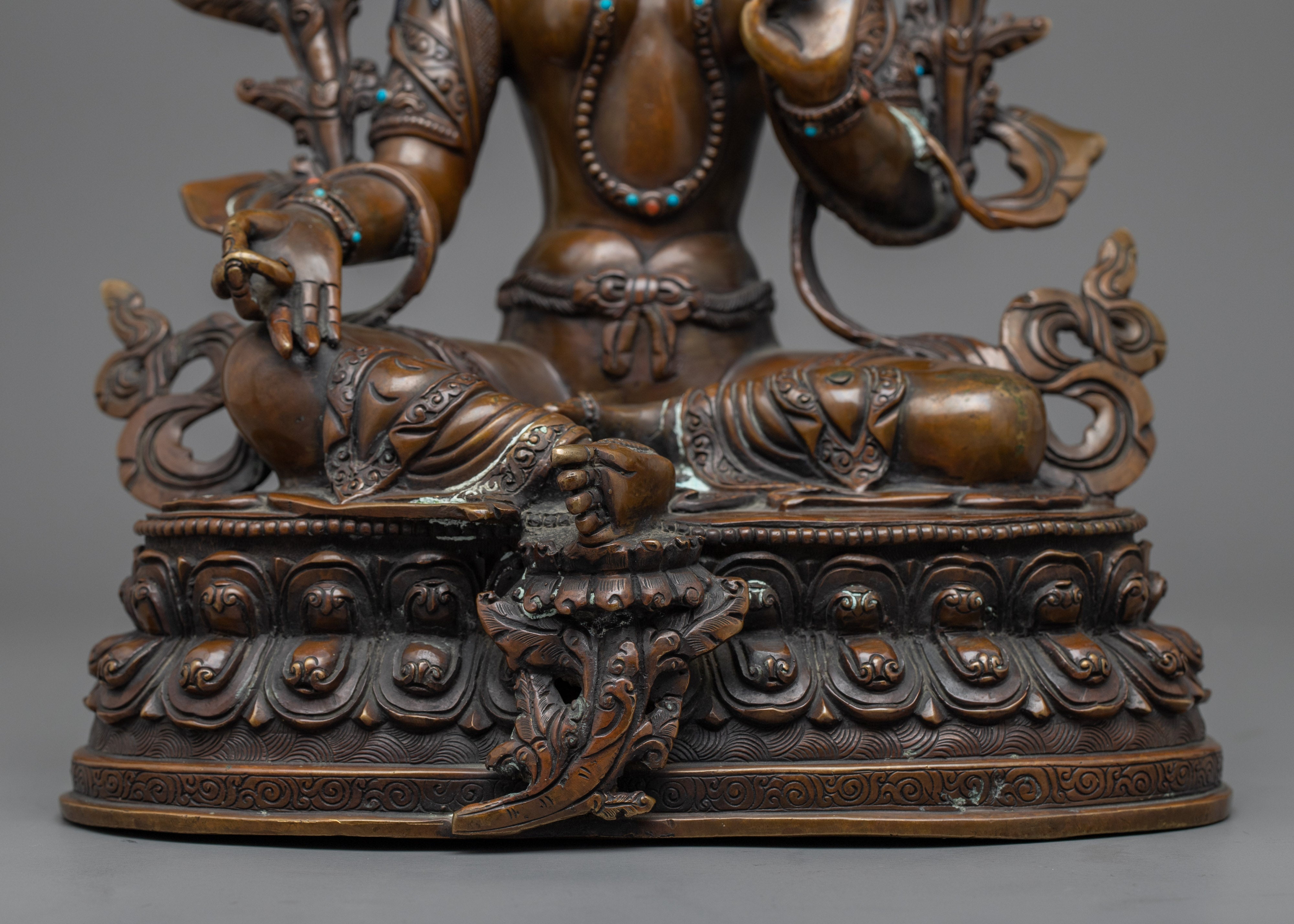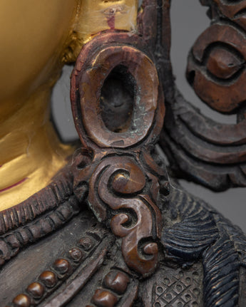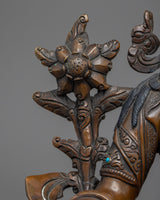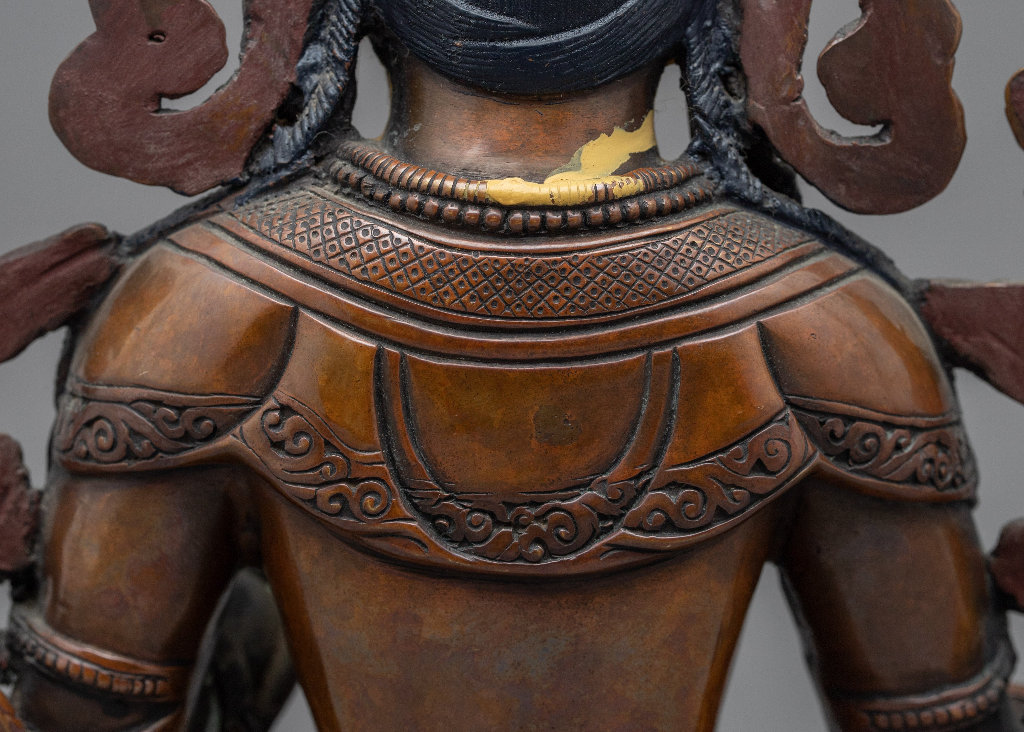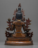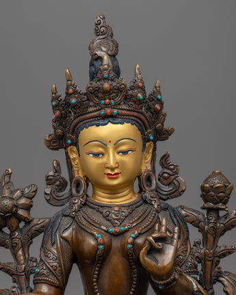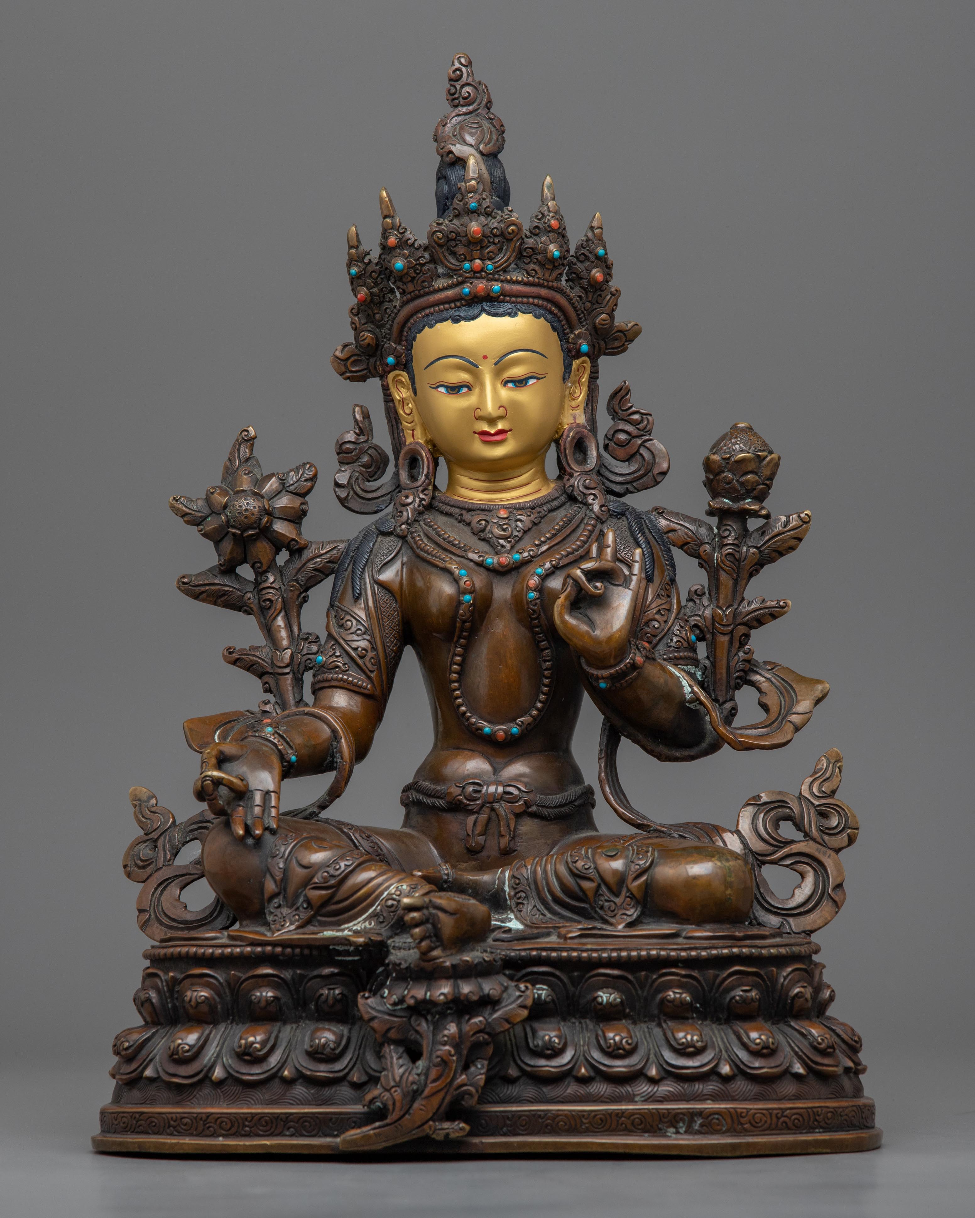 The statue is comprised of oxidized copper and partially gilded in gold, like the Green Tara's face, which is also highlighted with acrylic colors enhancing her sublime facial expression. She is bejeweled with precious gemstones like the turquoise meticulously placed by our artists. It is the perfect keepsake for devout individuals like yourself, suitable for use in Buddhist rituals, and will make a magnificent addition to your altar.