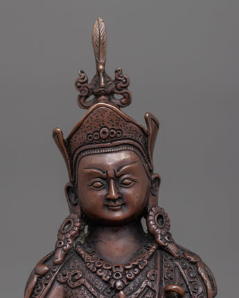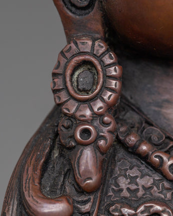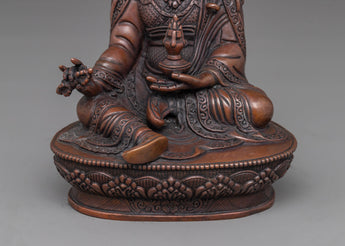 The Guru Rinpoche statue depicts Padmasambhava, also known as Guru Rinpoche, who is regarded as the founder of Tibetan Buddhism and a teacher of spiritual teachings. This statue, handcrafted with precise detail and featuring an oxidized copper body, demonstrates the remarkable skill of Tibetan skilled artisans. The statue stands 9.3"/23.5cm tall and has a base of 5.7"/14.5cm. It weighs 1.36 kg and is an ideal centerpiece for any altar or sacred space.