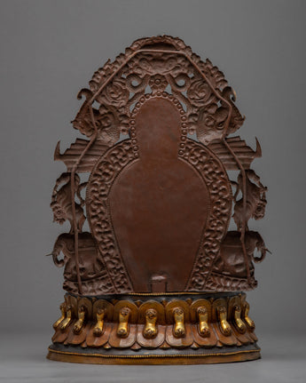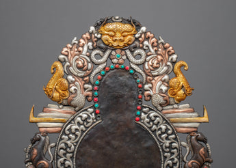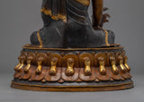 The perfect, detailed patterns on the Healing Buddha Statue were entirely hand-carved in our workshop using traditional Himalayan art. The statue was traditionally molded using oxidized copper and then delicately painted with acrylic paint to enhance the details of the deity. This piece of art has a unique and captivating appearance as it has gold gilding and silver plating. Here the deity is depicted seated on a lotus throne. We have gilded the part of the throne, the edge of the robe, and the lotus seat with genuine 24K gold. The other part of the throne and halo is silver-plated. Here the Buddha's right-hand rests softly on the ground while holding a bowl containing medicine and a Myrobalan plant.