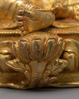 This exquisite piece of Green Tara Deity employs traditional Himalayan motifs and designs delicately produced in our studio. Gold-gilded, the statue exudes brilliant luster and intricate carving over a months. Revered for her compassion, the female Bodhisattva is depicted with a peaceful, compassionate facial expression highlighted by the acrylic color. She sits on a moon disc lotus seat with an elaborately carved head piece while two lotuses bloom beside her shoulders.