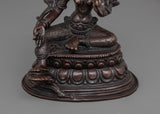 Green Tara is depicted seated in a ready stance with one leg outstretched to respond quickly in times of need. Her right hand is in the varada mudra, indicating infinite giving, while her left hand is holding a utpala lotus, which represents purity and spiritual enlightenment. The oxidized copper body accentuates her heavenly and protecting the aura, making this statue an effective spiritual instrument for evoking Tara's blessings of protection, compassion, and direction on the path to enlightenment.