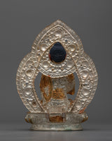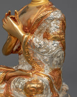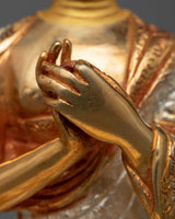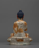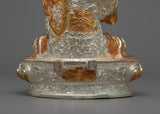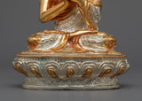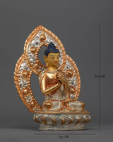 Discover the serene elegance of our Vairochana Buddha Statue, which was skillfully created by expert artisans. This statue stands 10.2 inches tall and has a 7.5-inch base. It is made of copper and is adorned with 24K gold gilding, silver plating, and delicate acrylic paintings. Vairochana Buddha, considered as the incarnation of the Dharmakaya, embodies the wisdom of the all-encompassing void as well as enlightenment.