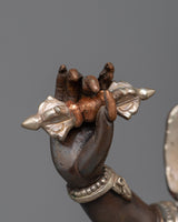 With our Vajrapani Bodhisattva Art, you may bring the manifestation of spiritual strength and heavenly energy into your home. This statue stands 12.7 inches tall and 9.4 inches wide, making it an ideal addition to your shrine, house, or meditation place. The statue is made of an oxidized copper body that has been silver-plated, representing the long heritage of Buddhist craftsmanship and giving it a distinct antique appearance.