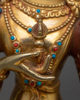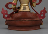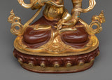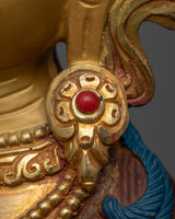 With our expertly carved Vajrasatva statue, you can enter the realm of spiritual purification.The sturdy, oxidized copper framework of this item is elegantly juxtaposed by a brilliant layer of 24k gold, designed with great attention to detail.Acrylic paintings precisely emphasize the intricacies, depicting Vajrasattva's symbols and features with finesse, creating a remarkable work of art rich in both beauty and meaning.