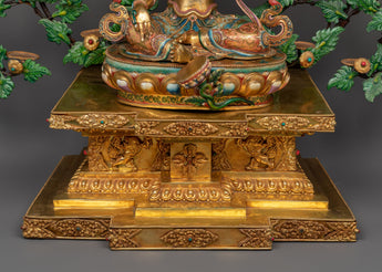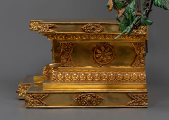 A tranquil Buddha watches over the holy congregation from above, completing the tree-like depiction of spiritual nourishment and shelter. Each detail is a work of art, enrobed in brilliant 24k gold and adorned with elaborate acrylic paintings that reflect the different traits and benevolent energy of the Tara deities.